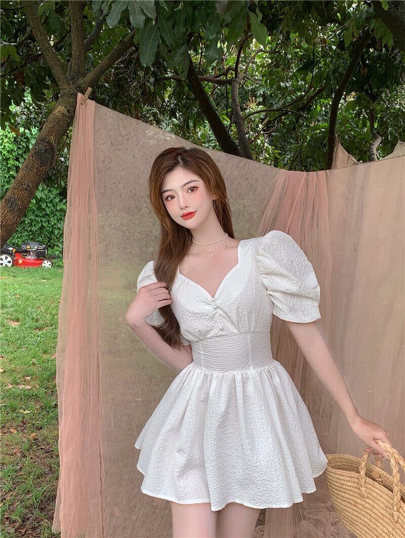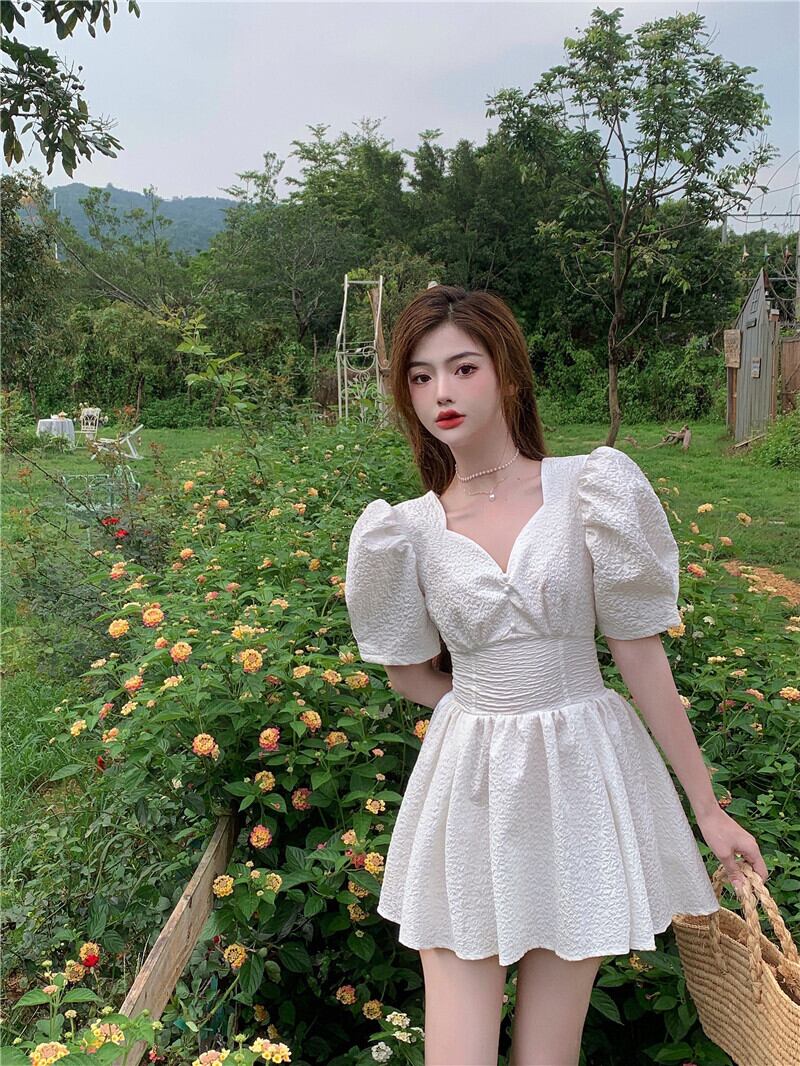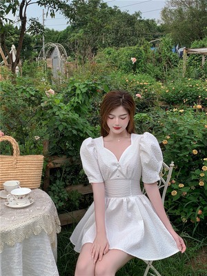 スタイルスタンダードスリーブジャカードVネックウェストドレス サマーホワイト レトロ 大人ガーリー スウィート キュート カジュアル 夏物 Xiaofeijia61509717984