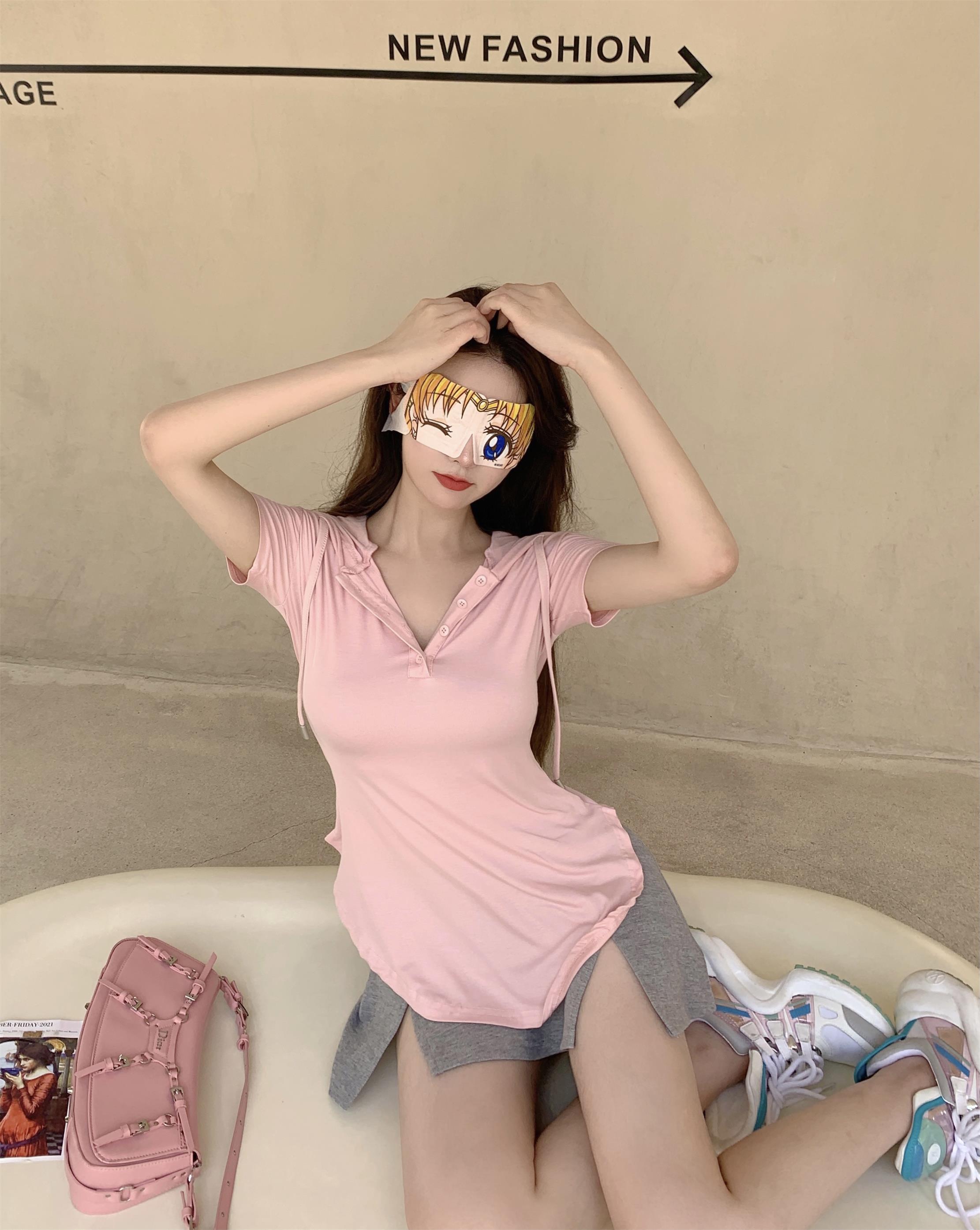 サマーフードVネックTシャツ ピンク 夏物 Xiaofeijia63659464286