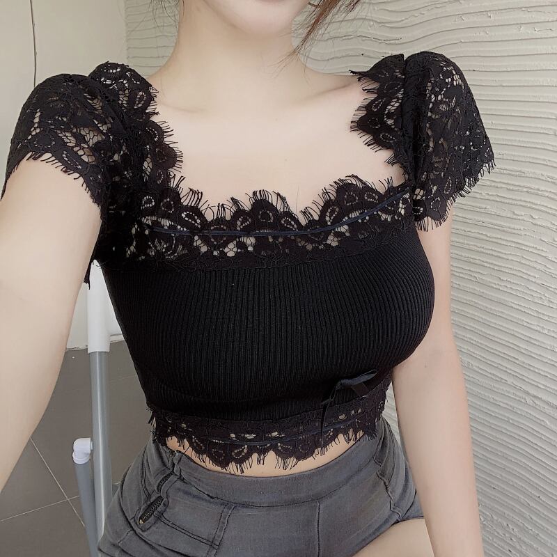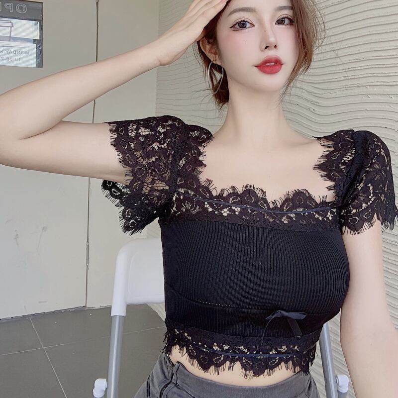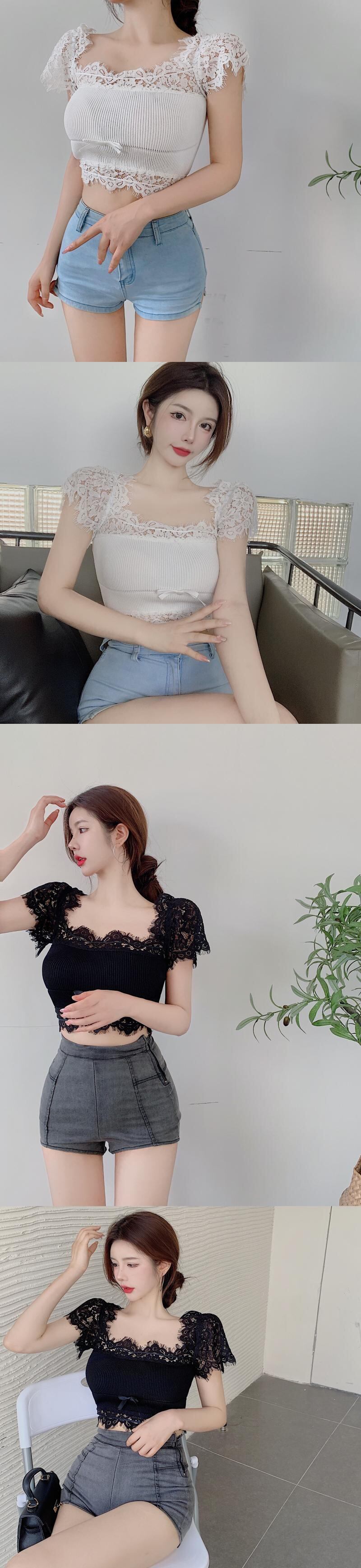 リボンニットショートトップス レース サマー 夏物 ステッチ Xiaofeijia3881112421