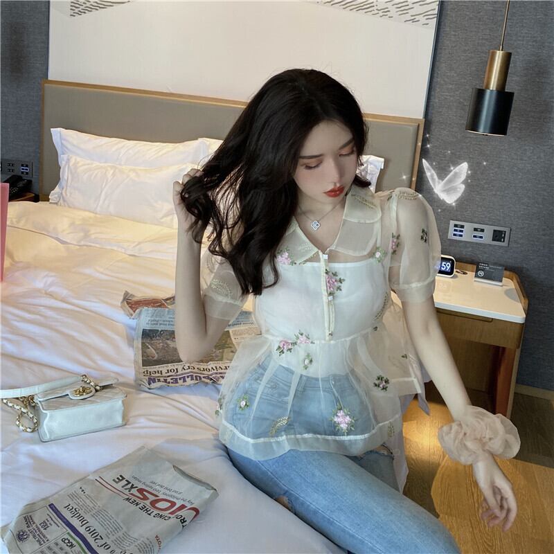 Flowerデザイン ウェストショートトップス レディースサマースリーブシフォンシャツ レッド 刺繍 夏物 フラワーデザイン Xiaofeijia42109225025
