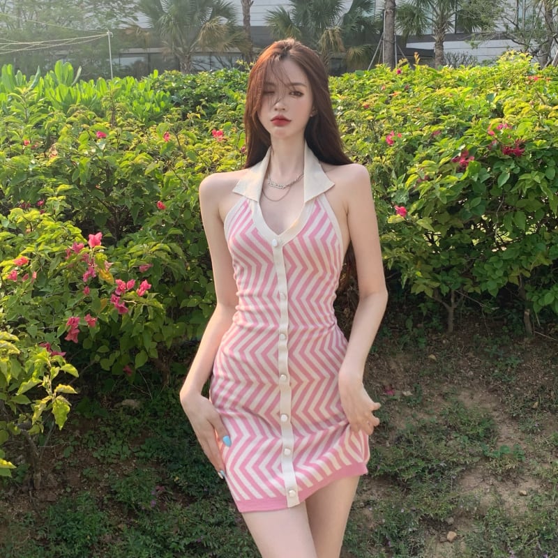 Vネックスリムウェストスカート ホルターニットドレス Xiaofeijia82139967098