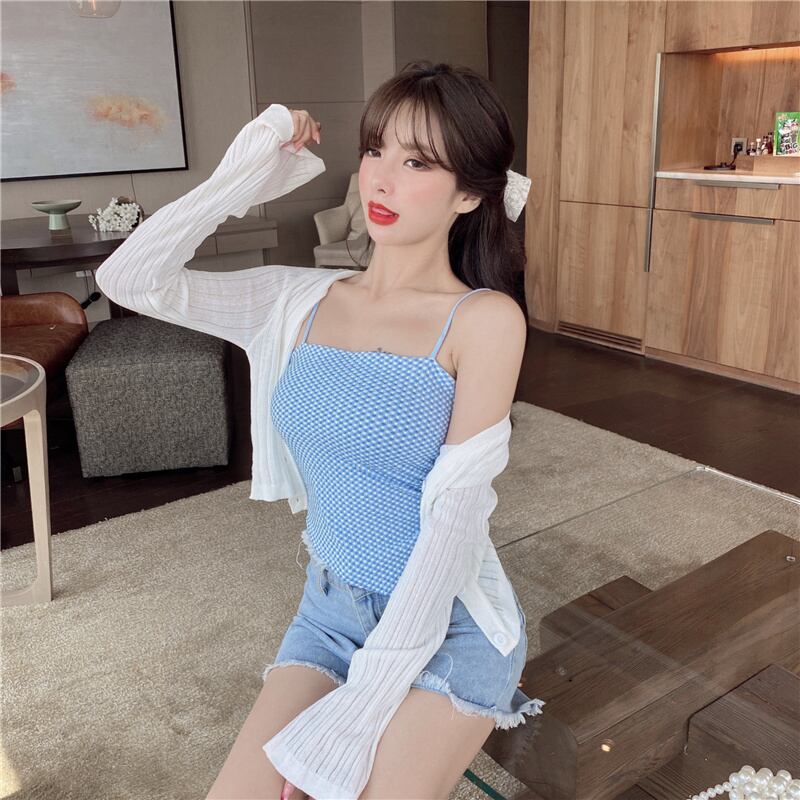 色:白いカーディガン,ブラックカーディガン,青いスリング,ブラックサスペンダー