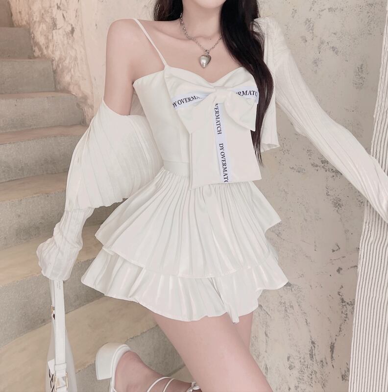 ホワイトカーディガンサマーリボントップス ダブルプリーツFlowerデザイン ショートスカート 大人ガーリー スウィート キュート カジュアル 夏物 フラワーデザイン Xiaofeijia97492094359