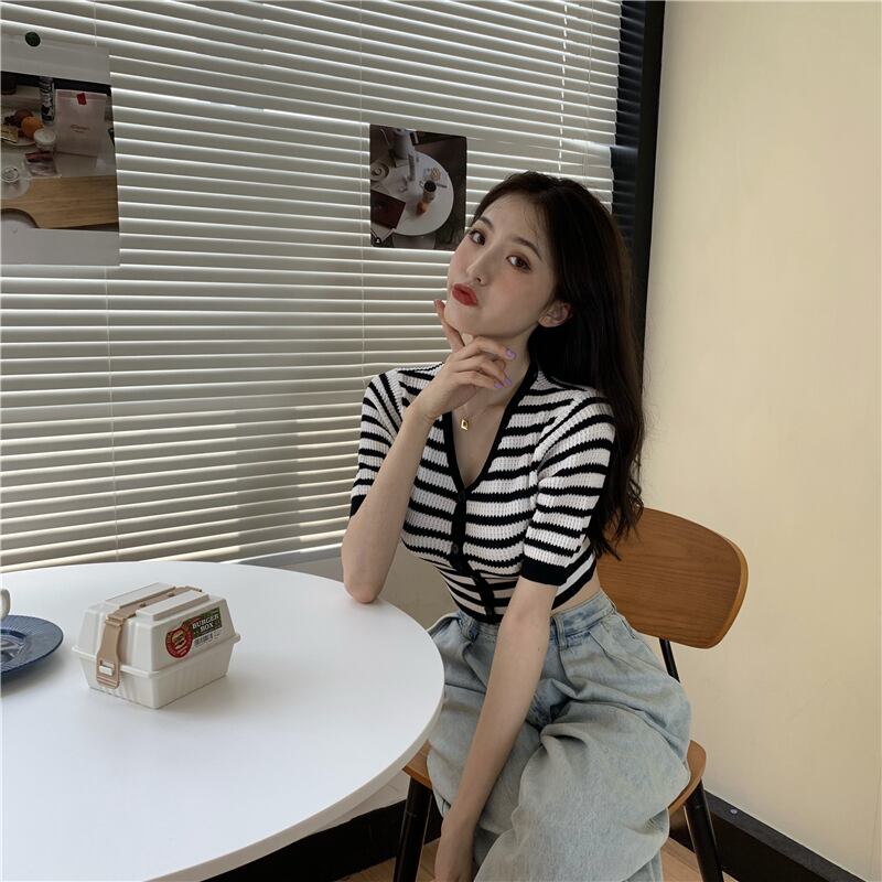 Vネックストライプセーター カーディガン Xiaofeijia6590464141