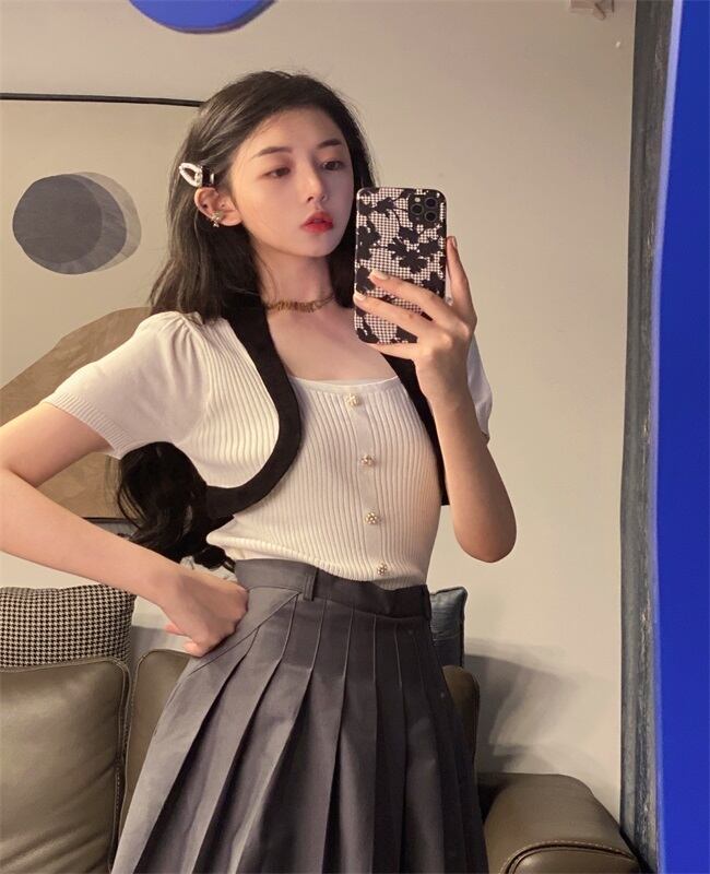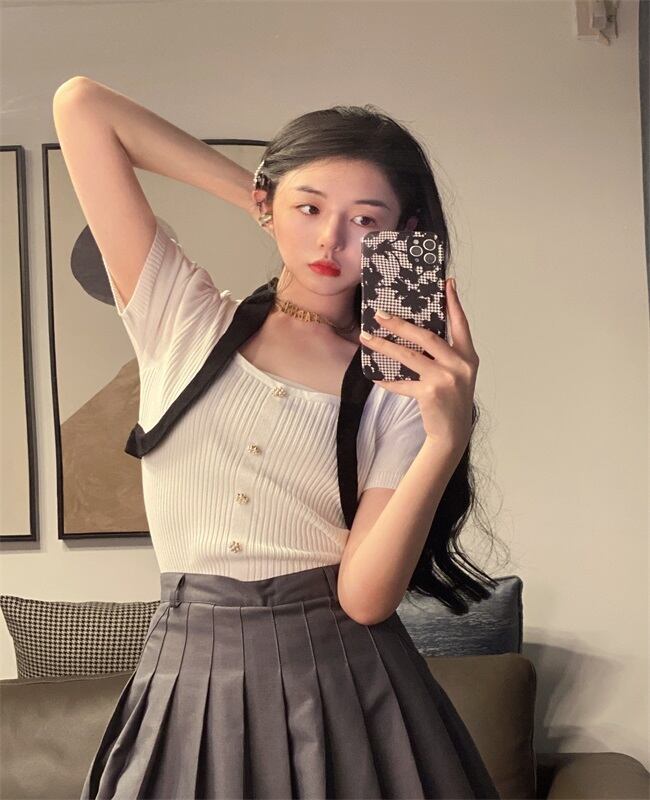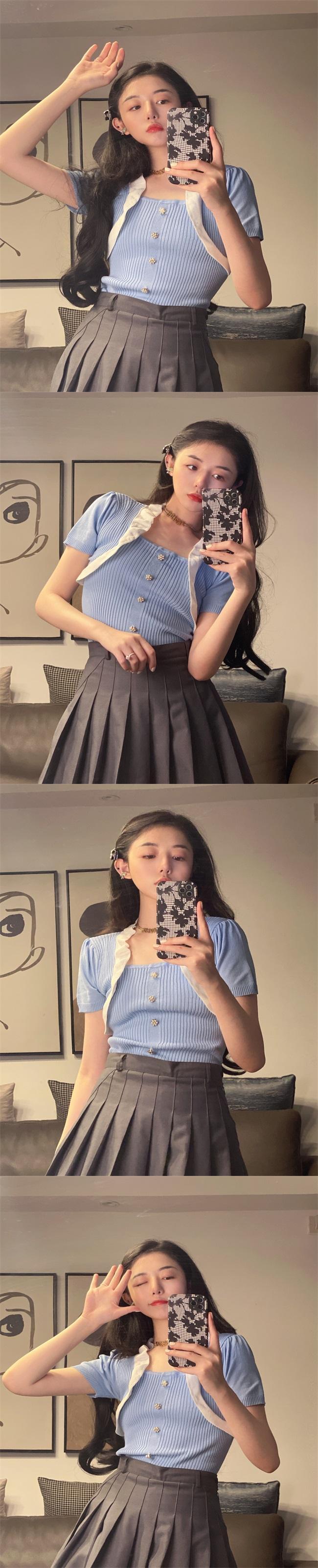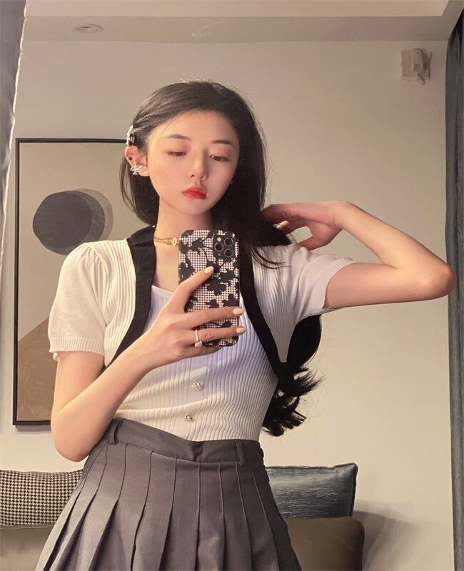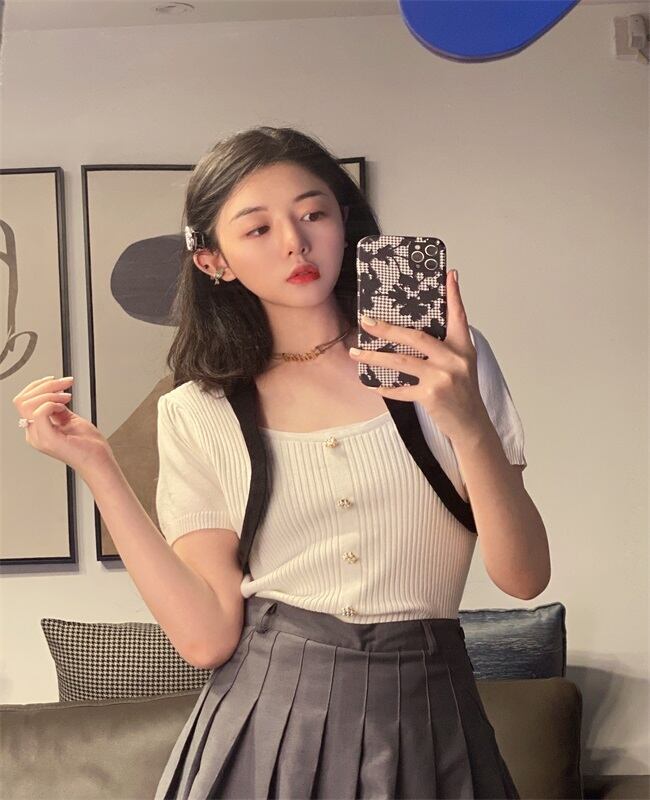 サマーニットTシャツ スリーブショートトップス 大人ガーリー スウィート キュート カジュアル 夏物 スクウェア Xiaofeijia79687192891