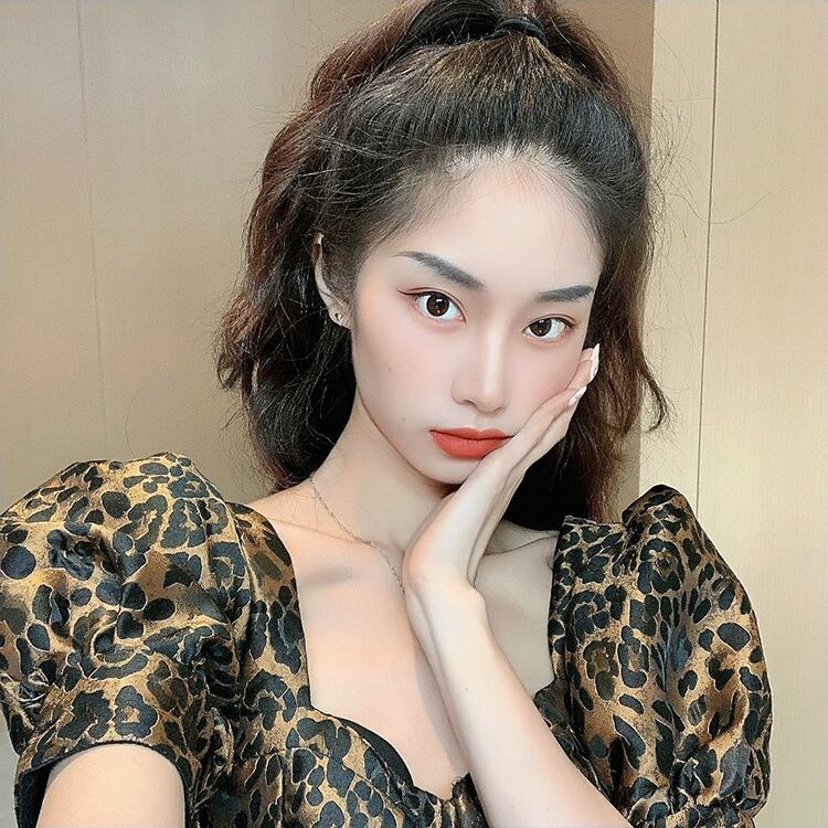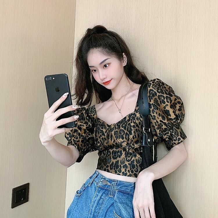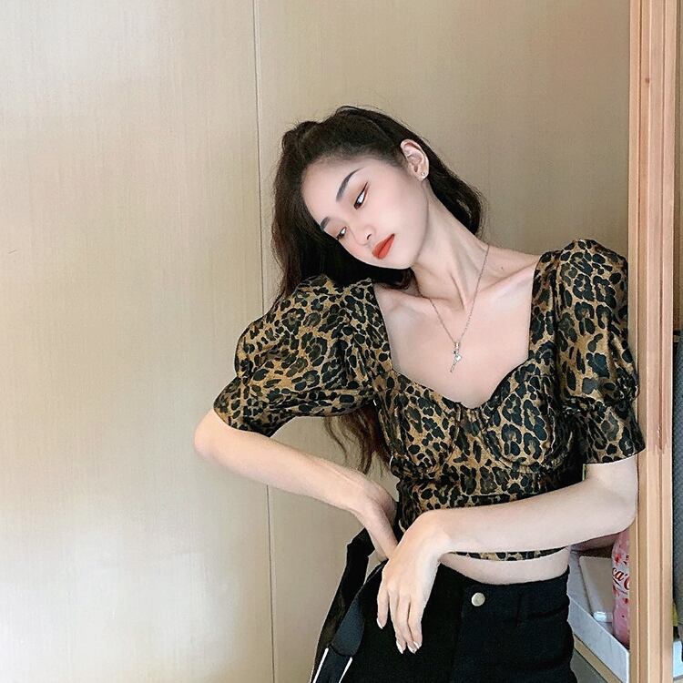 カラーサマーショートトップス レオパードプリント柄スリーブスタンダードシャツ レトロ 夏物 スクウェア Xiaofeijia71943669527
