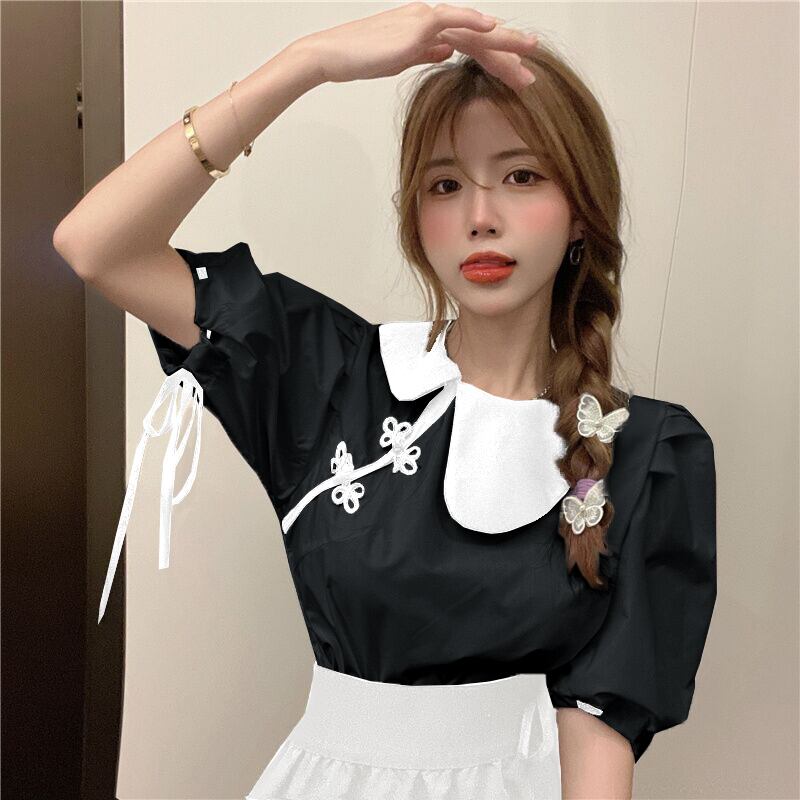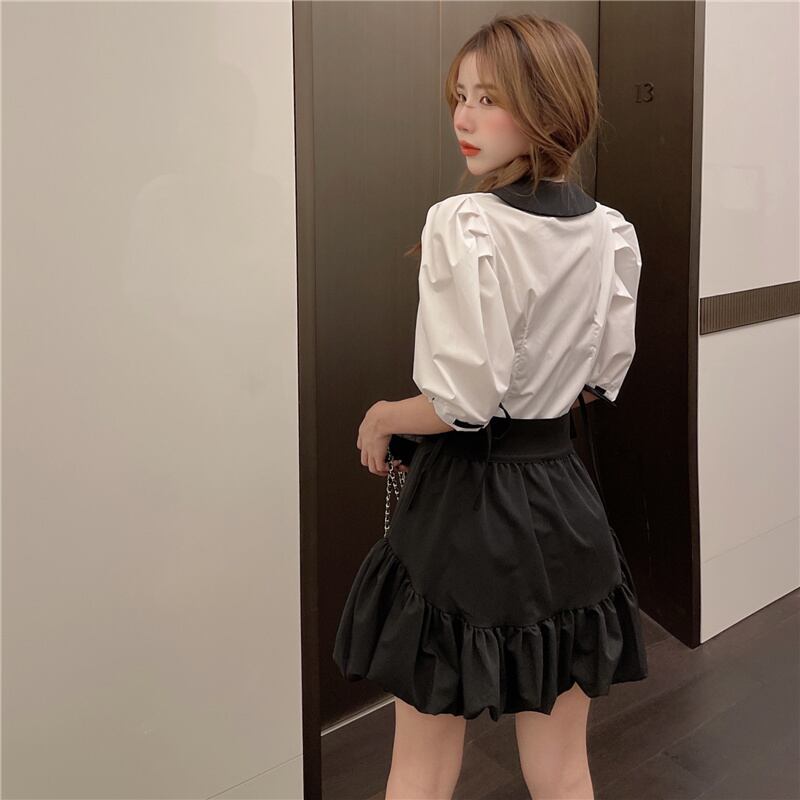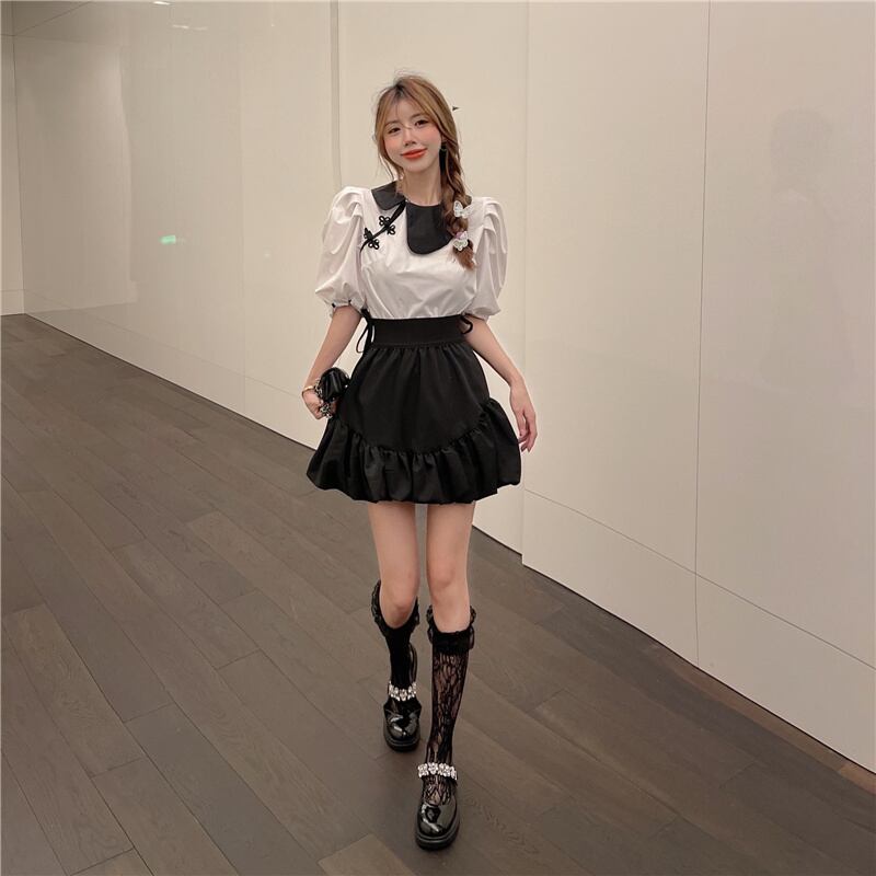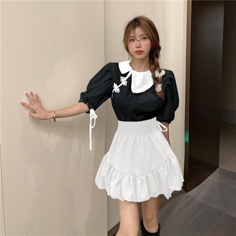ウェストFlowerデザイン スカート サマーブラックAラインスリムショート ふわふわ 夏物 フラワーデザイン Xiaofeijia87442332610