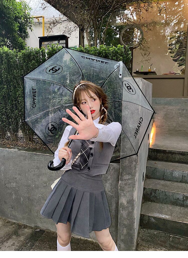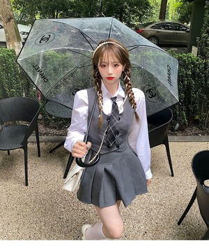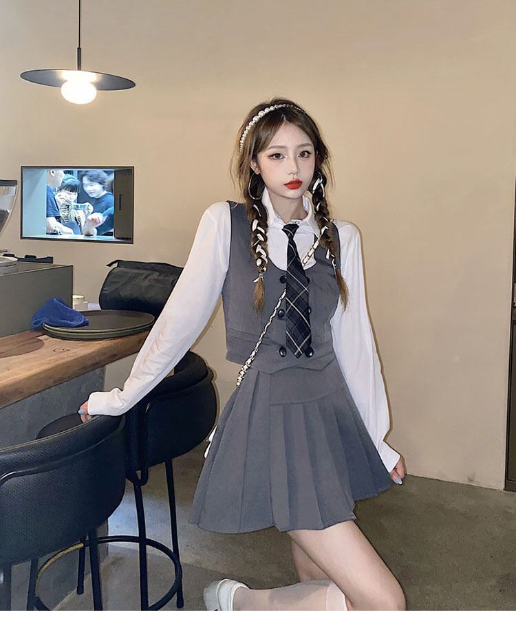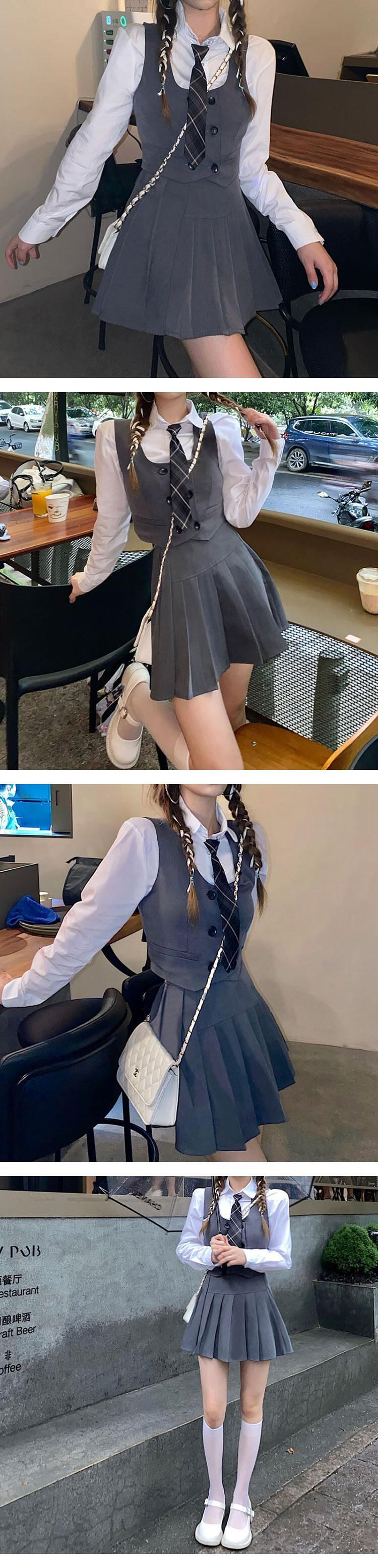 色:白のシャツ,グレーのベスト,グレープリーツスカート,グレーのチェックネクタイ