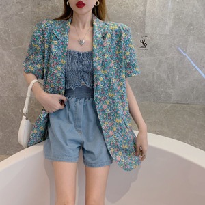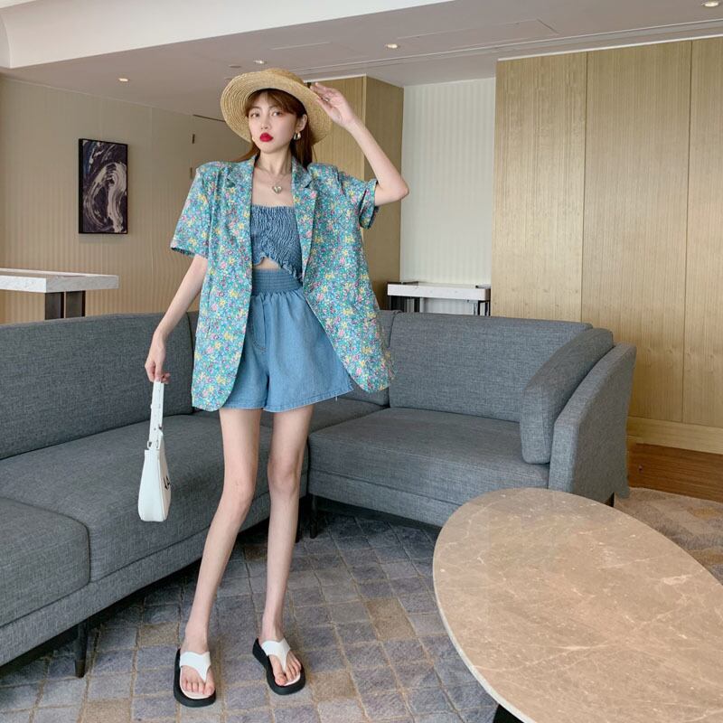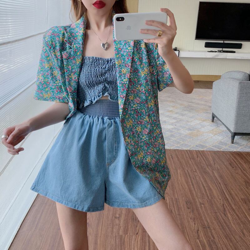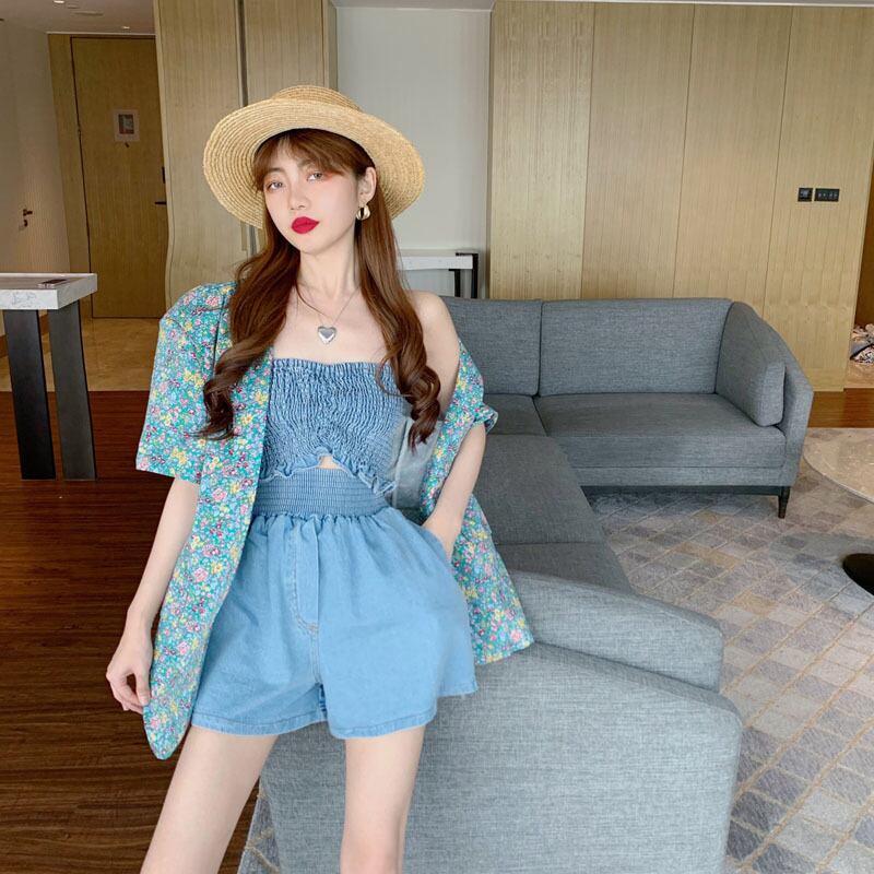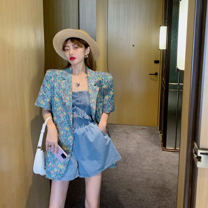 色:花柄スーツ,カウチューブトップベスト,デニムショートパンツ