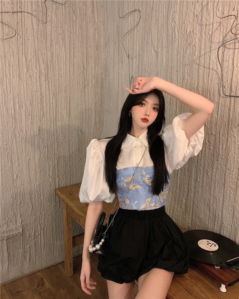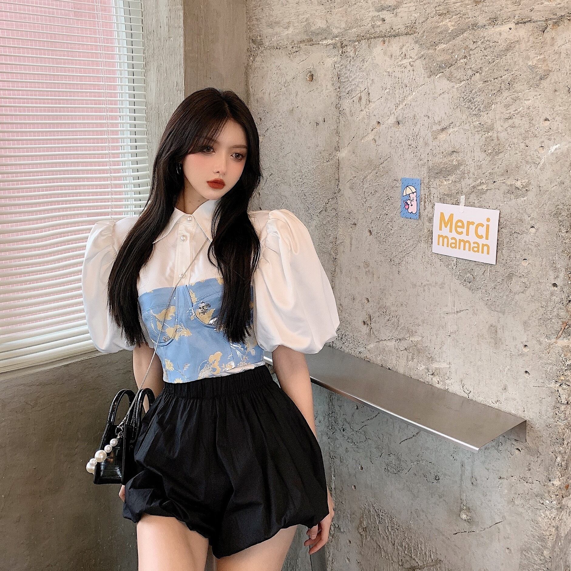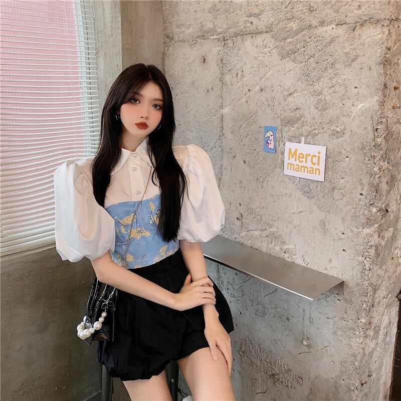 スタイルパールバックルスリーブシャツ ウェストハイウェストショートサマー レース 夏物 レースアップ 真珠 Xiaofeijia41425927453
