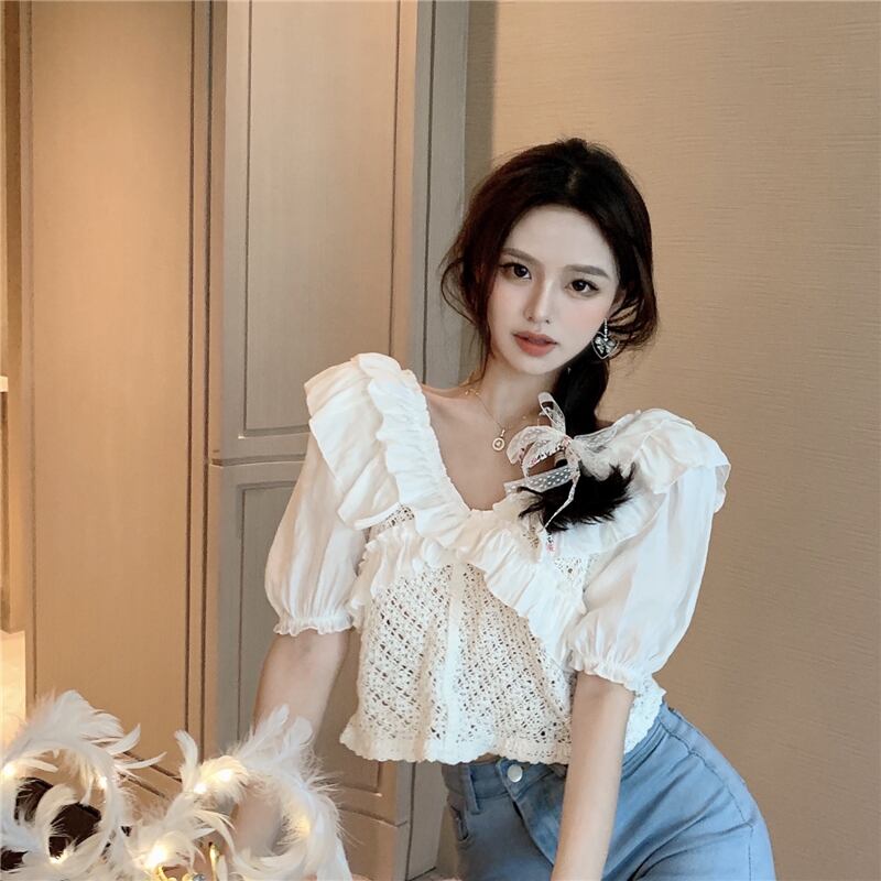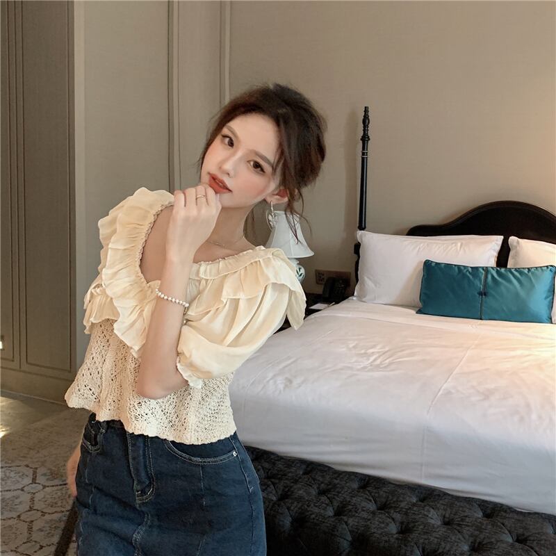 Vネックスリーブショートシャツ ラッフルトップス Xiaofeijia48083977478