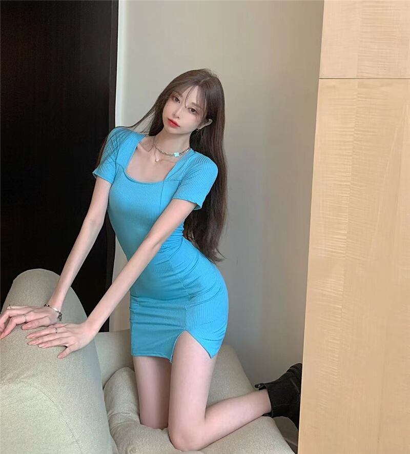スタンダードカラードレス サマーショートサイドスリットスカート レトロ 夏物 スクウェア Xiaofeijia86035738269