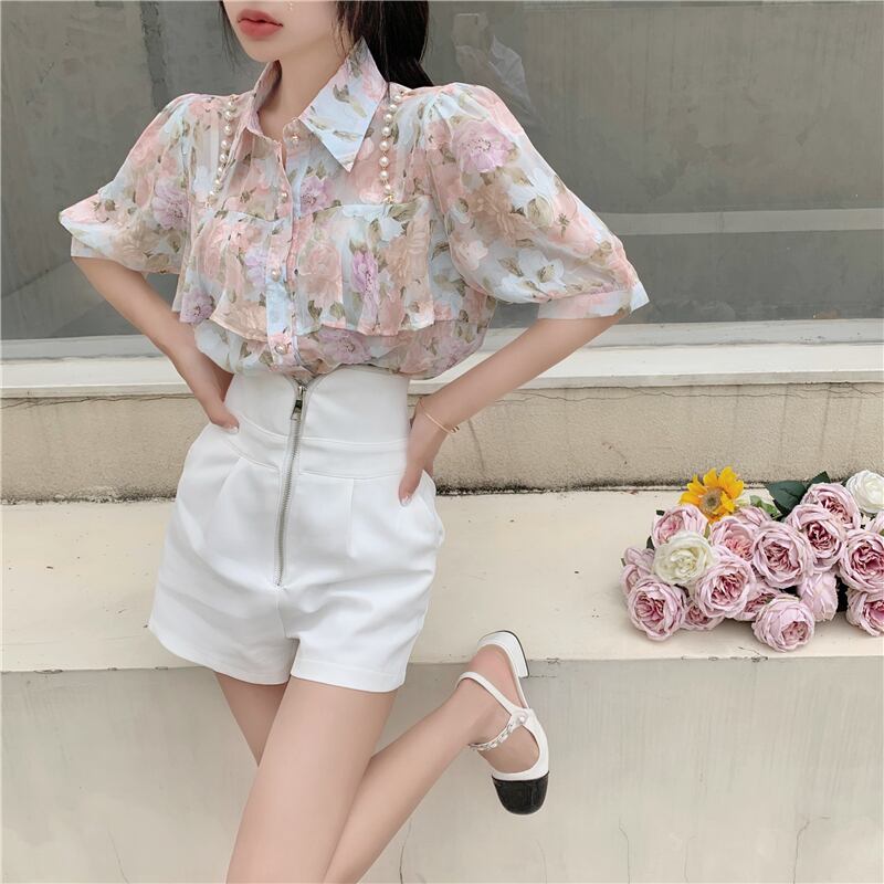 フローラルパールシャツ ハイウェストジッパーパンツ 花柄 真珠 Xiaofeijia78149211308