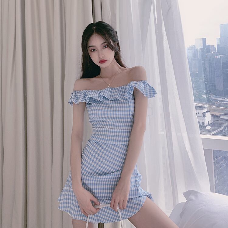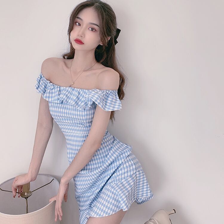 ブルー格子柄スリムドレス Xiaofeijia27811316259