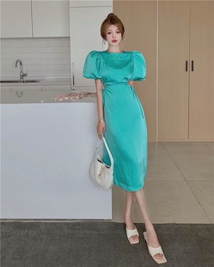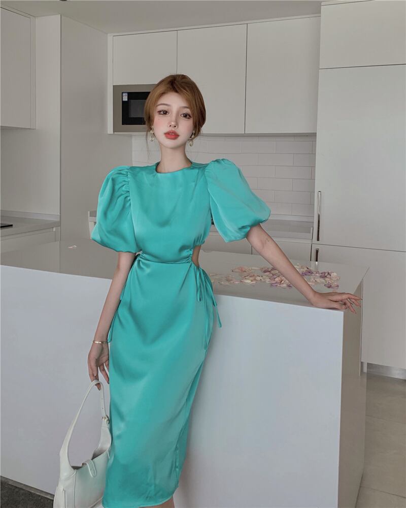 ウェストグリーンドレス スタイルサマースリーブミディスカート 夏物 Xiaofeijia40025272450