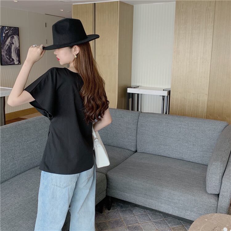 サイドウェストブラックTシャツ レディースサマーソリッド カラールーズトップス 夏物 ソリッドカラー Xiaofeijia40543719049