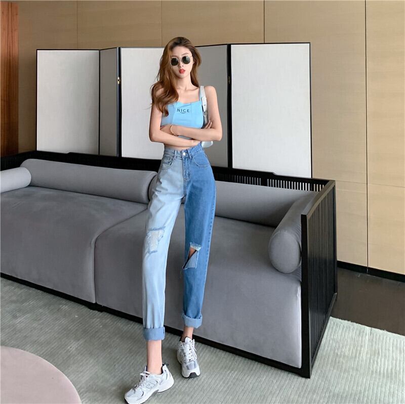 カラーアシンメトリージーンズ ハイウェストルーズパンツ 薄手 Xiaofeijia26589134510