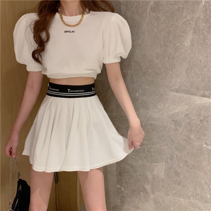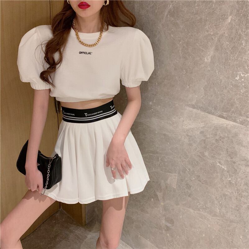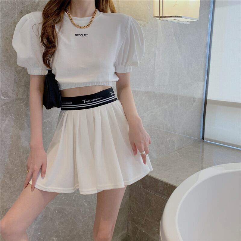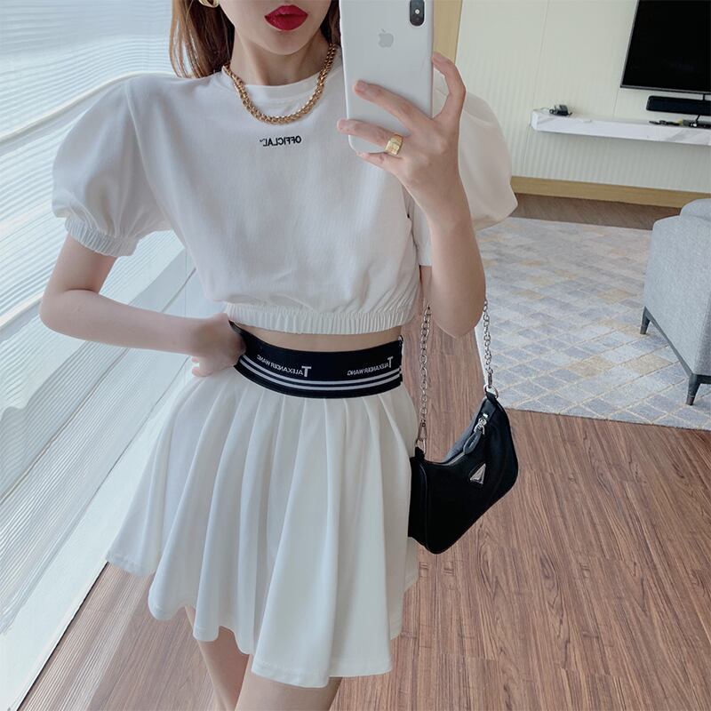 サマープリントスリーブTシャツ ハイウェストウェストプリーツスカート 夏物 Xiaofeijia75542598947