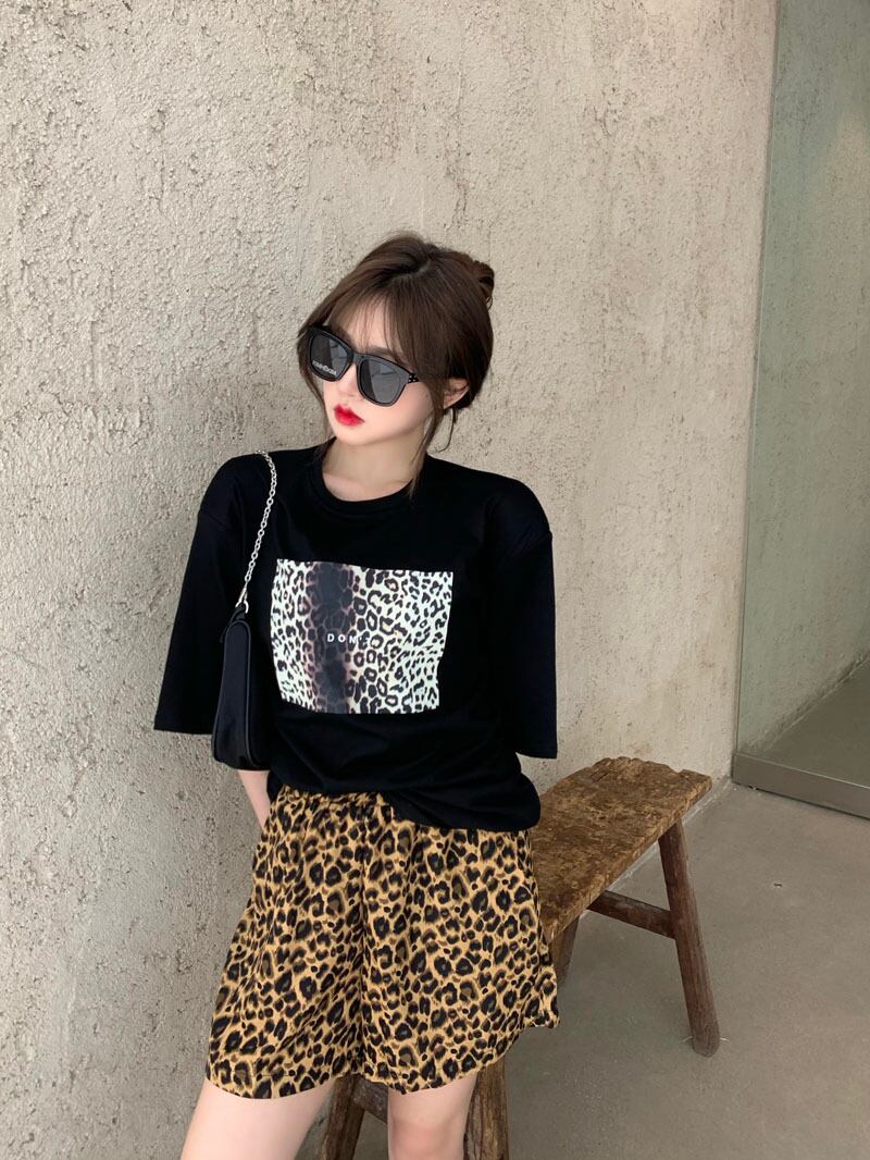 レッドレディース半袖スリーブラウンドネックTシャツ ハイウェストウェストレオパードショーツ ショート ハーフスリーブ ブルマー Oネック Xiaofeijia10726091266