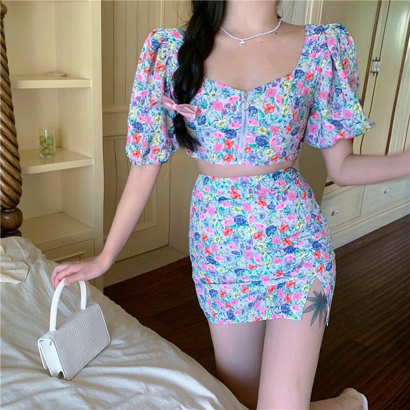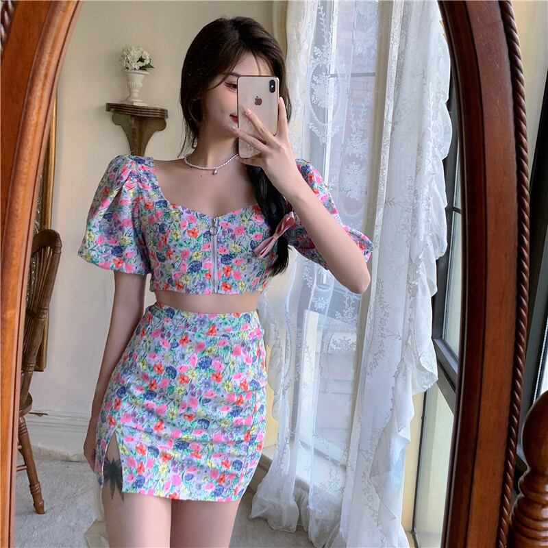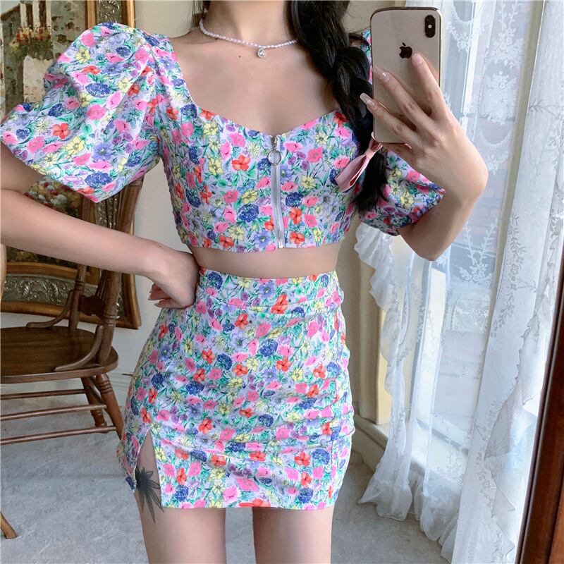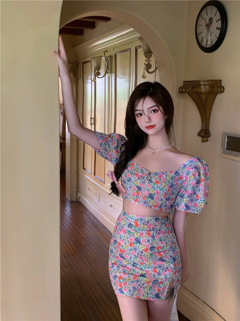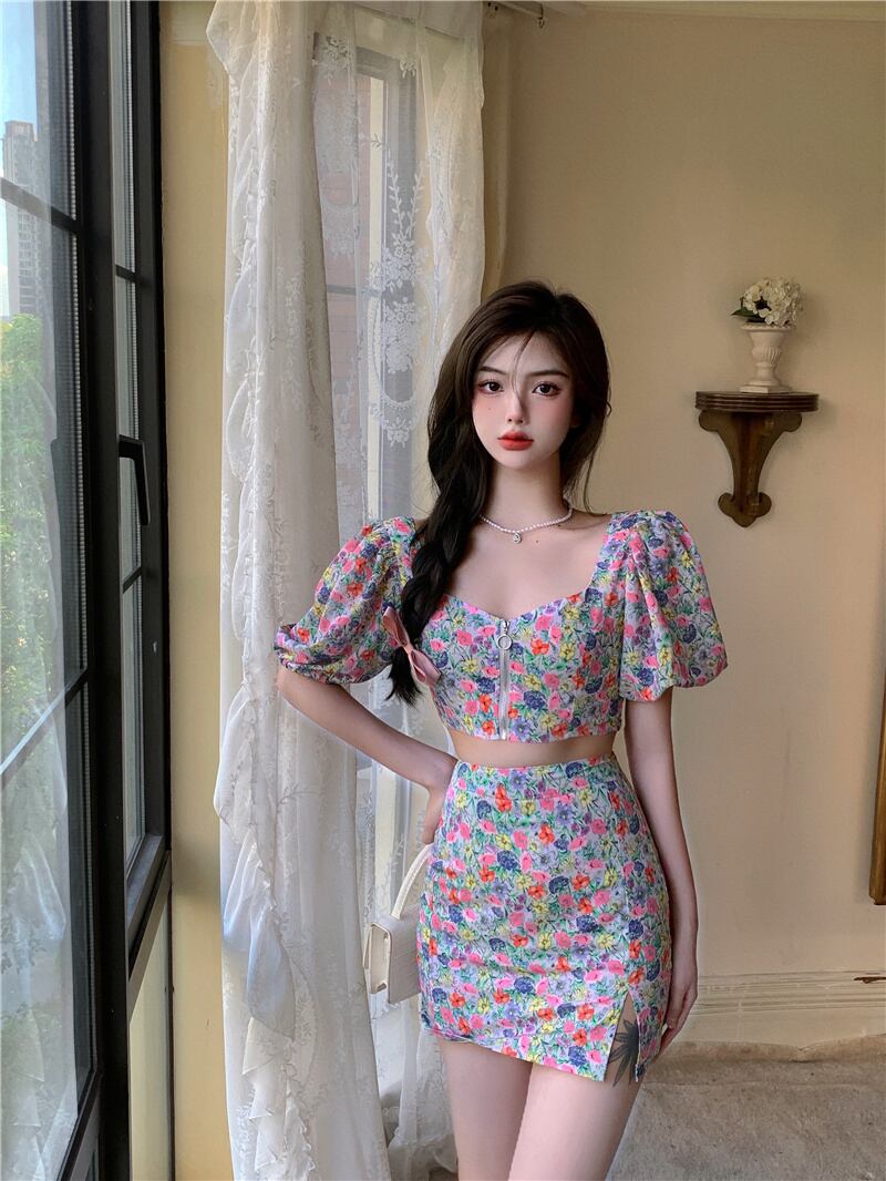 スタイルプリントレディーススリーブショートトップス ハイウェストウェストスカート Xiaofeijia69039240395