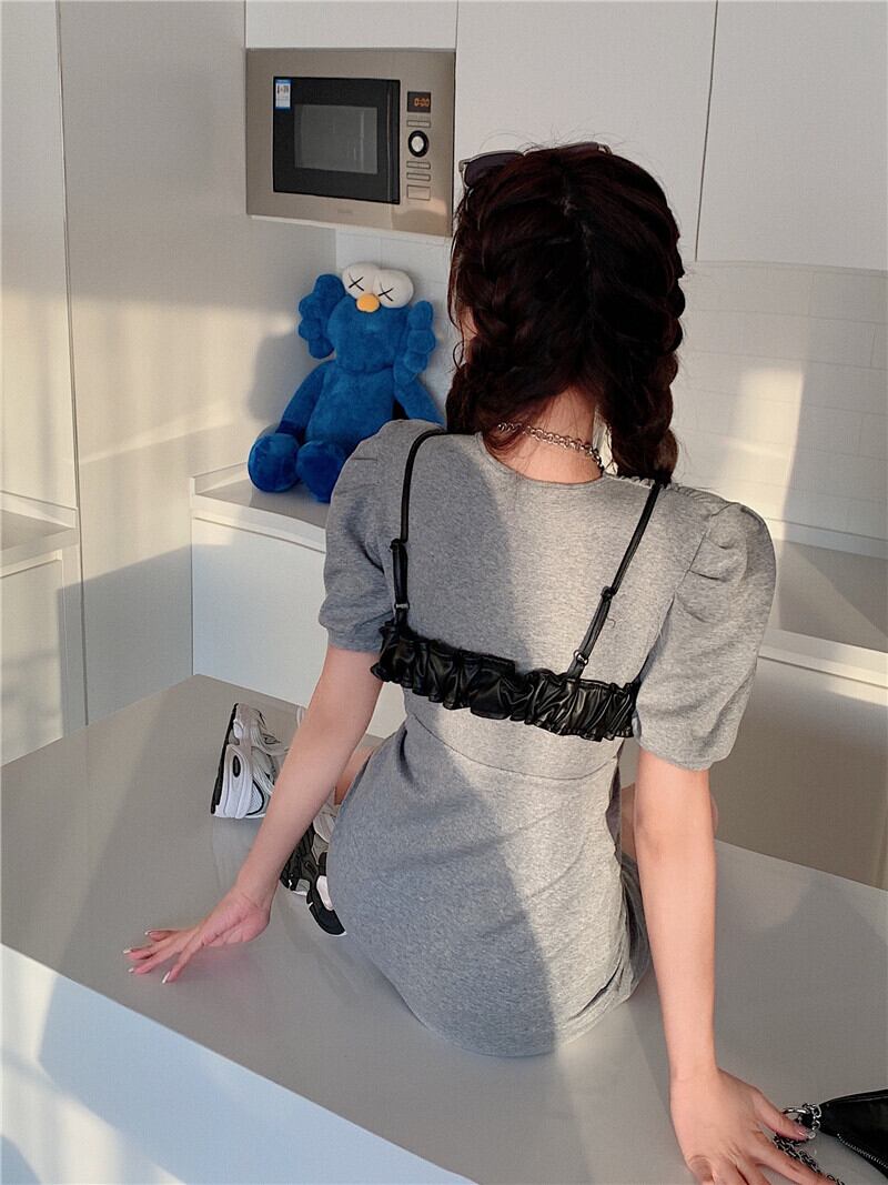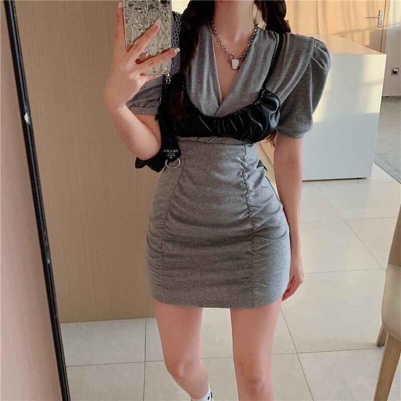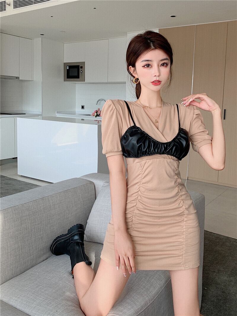 スリムVネックプリーツスリーブドレス レザー 大人ガーリー スウィート キュート カジュアル Xiaofeijia91742984238
