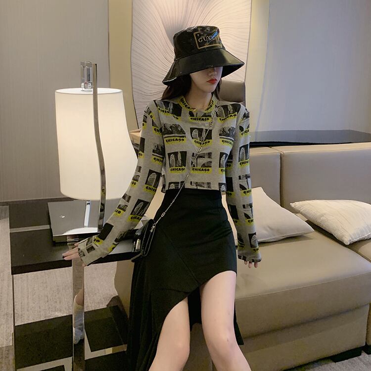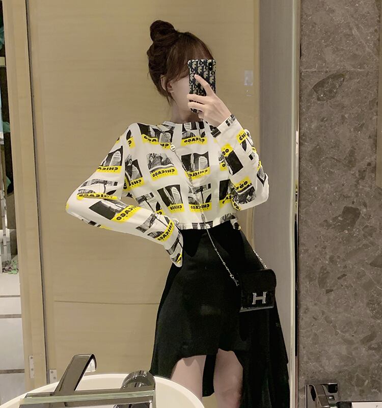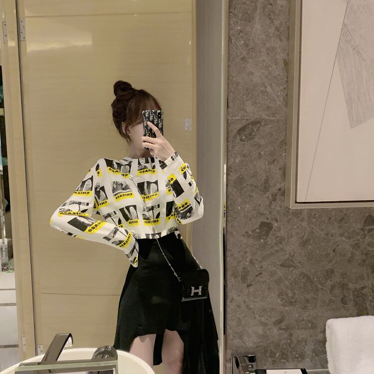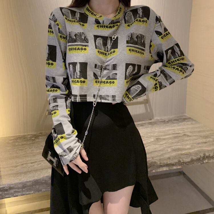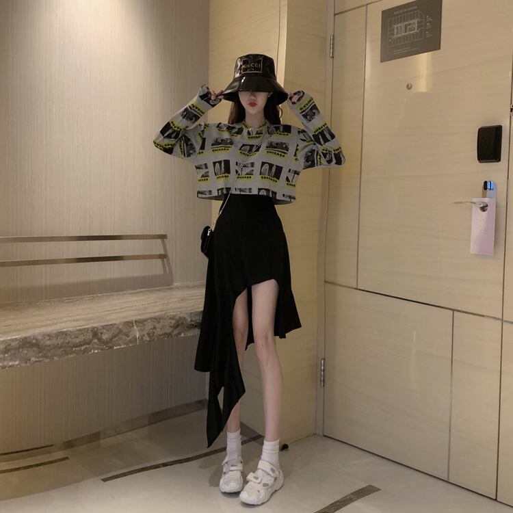 スプリングサマーショートスタンダードTシャツ ハイウェストスカート ロング レトロ 春物 夏物 Xiaofeijia96512204690