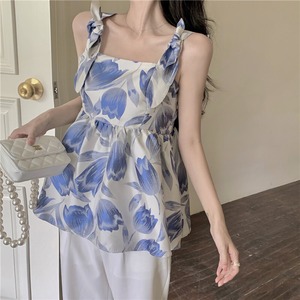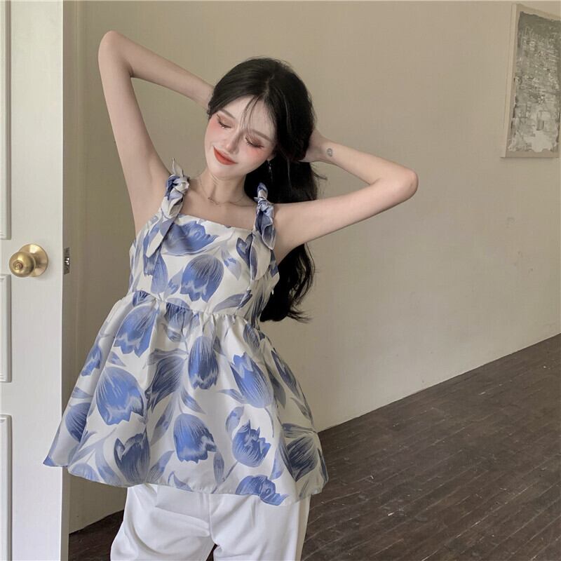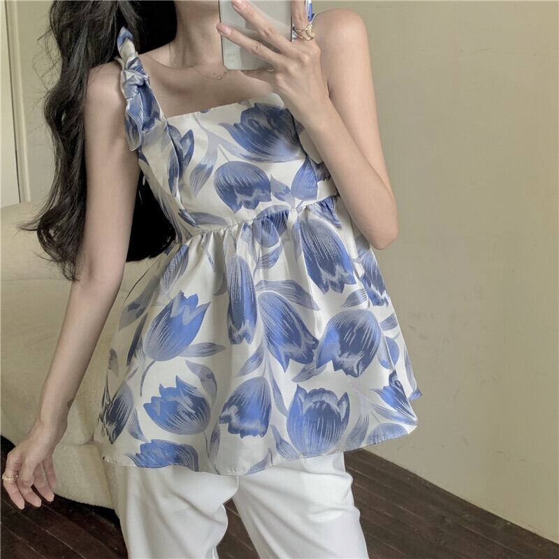 サマーホルタースタンダードラッフルプリント柄ノースリーブトップス レトロ 夏物 Xiaofeijia52594402505