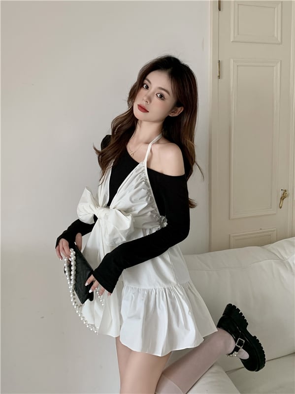薄手ホワイトドレス ストラップレスブラックシャツ リボン Xiaofeijia97920865599