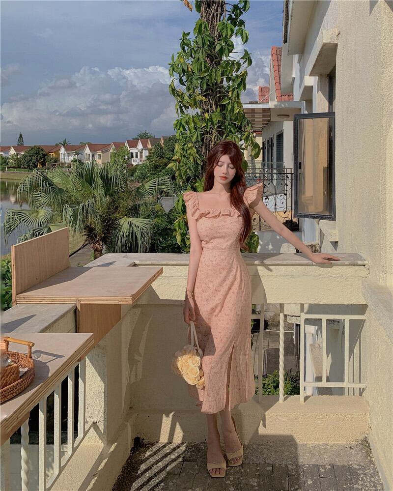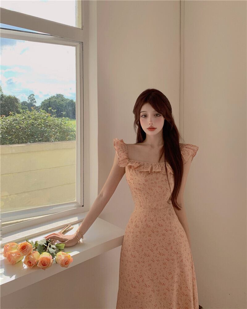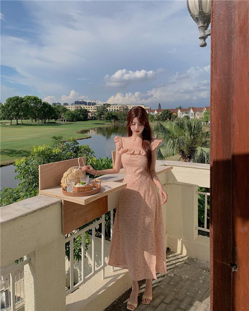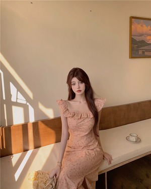 スタンダードハイウェストフローラルレースドレス レトロ 花柄 Xiaofeijia75546965353