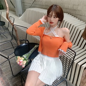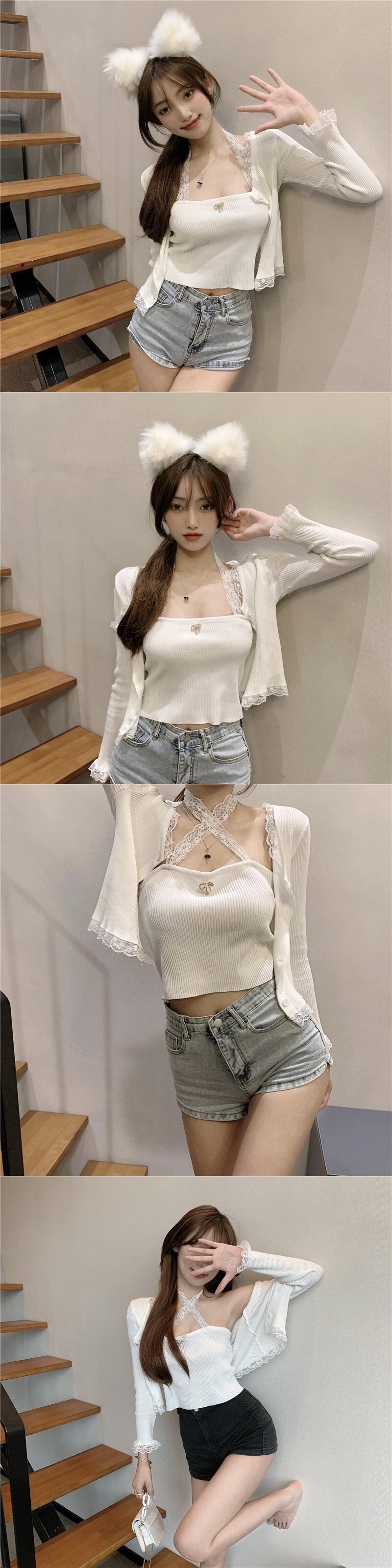 スタンダードレースホルターニットトップス カーディガン リボン レトロ Xiaofeijia11508947423