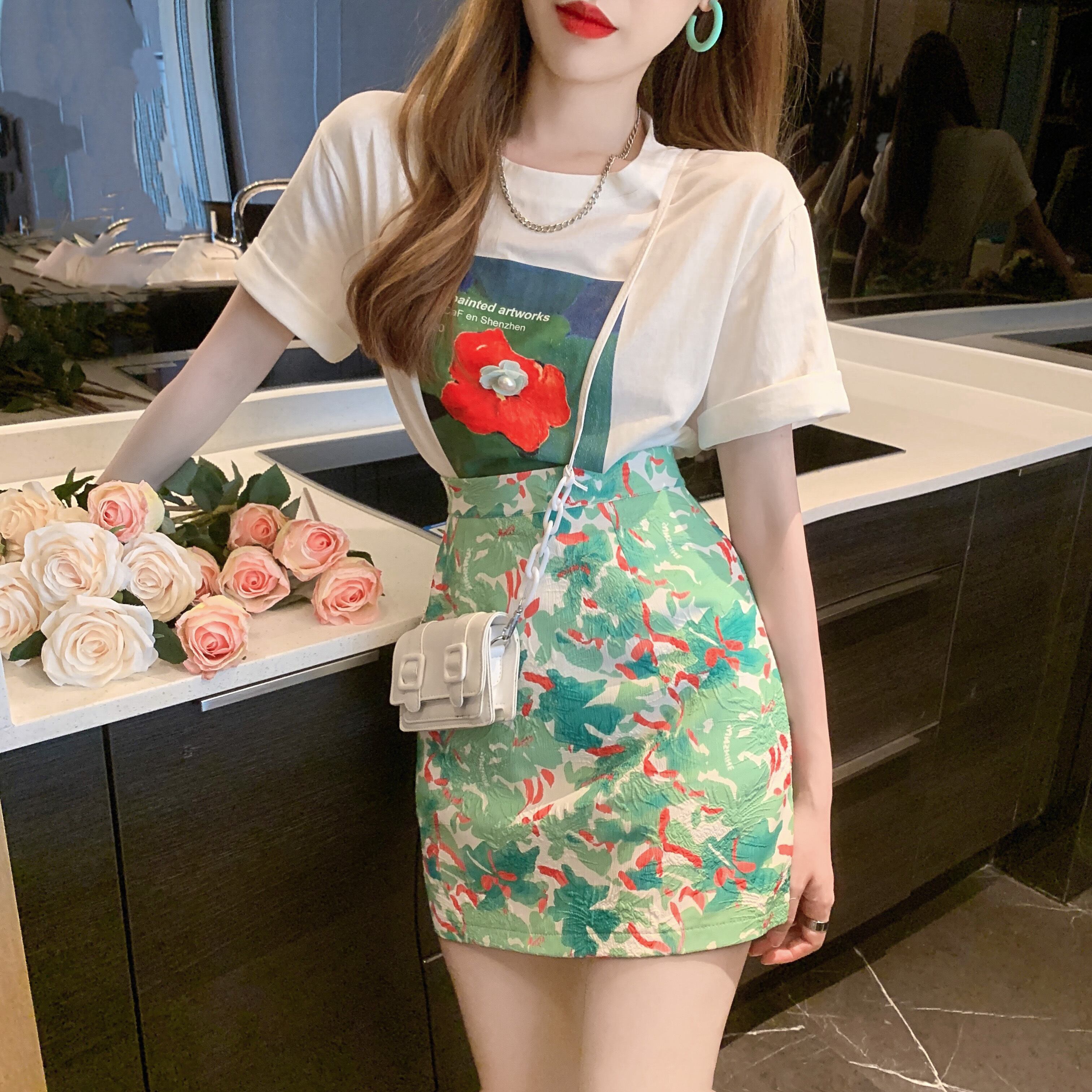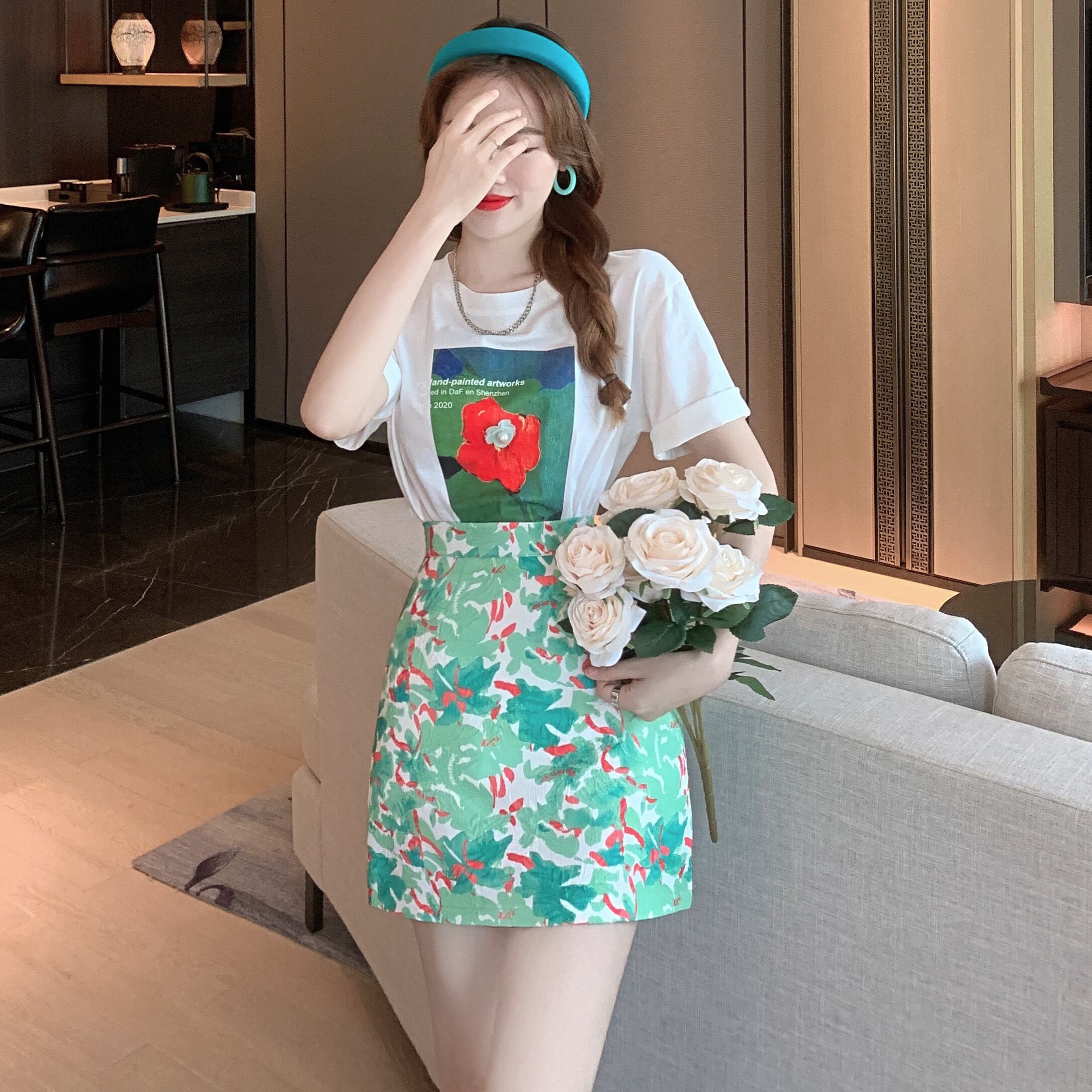 サマードレス トップス スカート プリントルーズショートTシャツ ハイウェストウェストAラインフローラルセット 夏物 花柄 Xiaofeijia64715531341