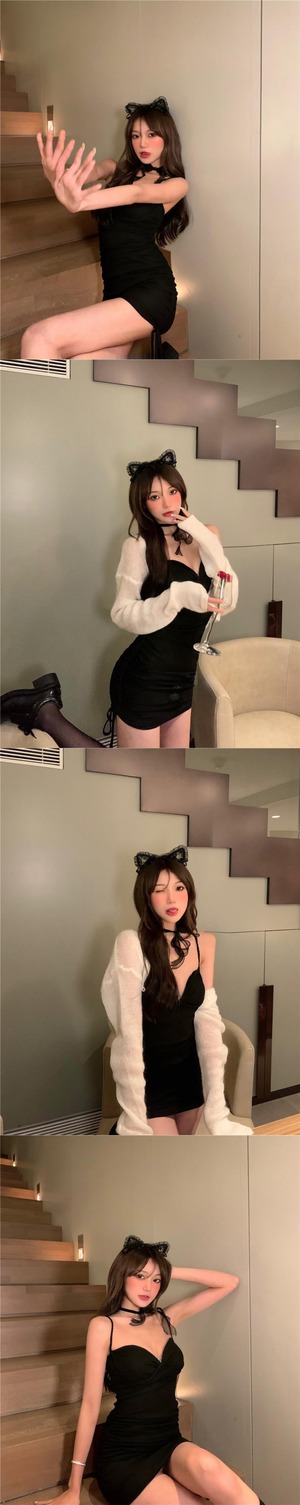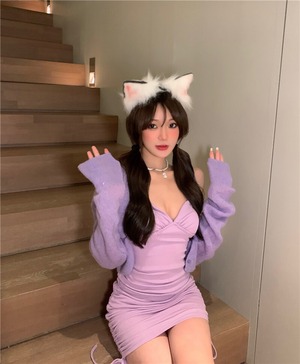 色:ブラックサスペンダースカート,パープルホルタードレス,白いカーディガン,パープルカーディガン