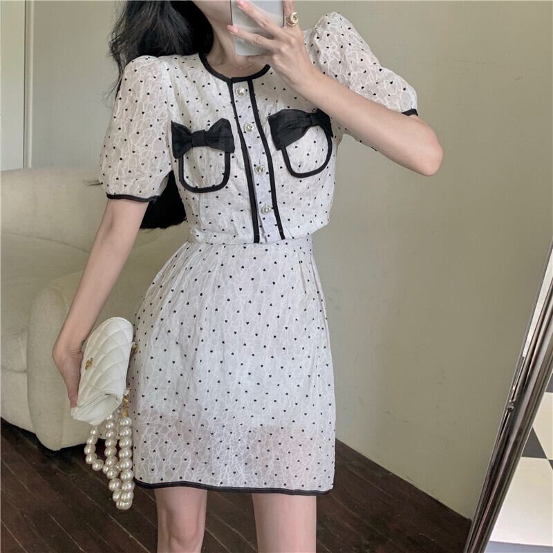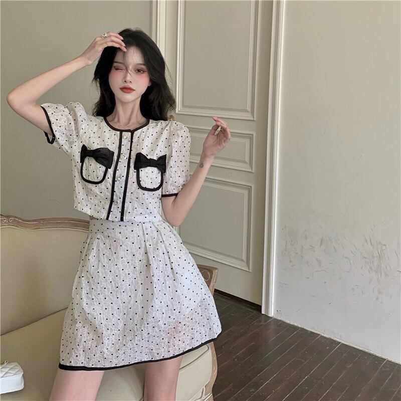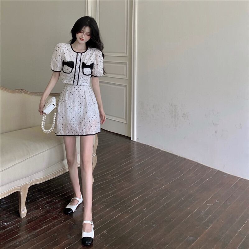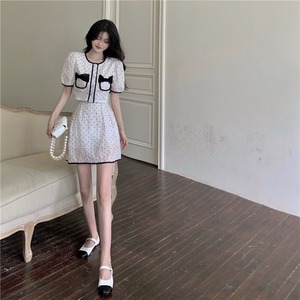 スカート サマースリーブ水玉トップス ハイウェストウェストショートセット リボン 大人ガーリー スウィート キュート カジュアル 夏物 Xiaofeijia20335722782