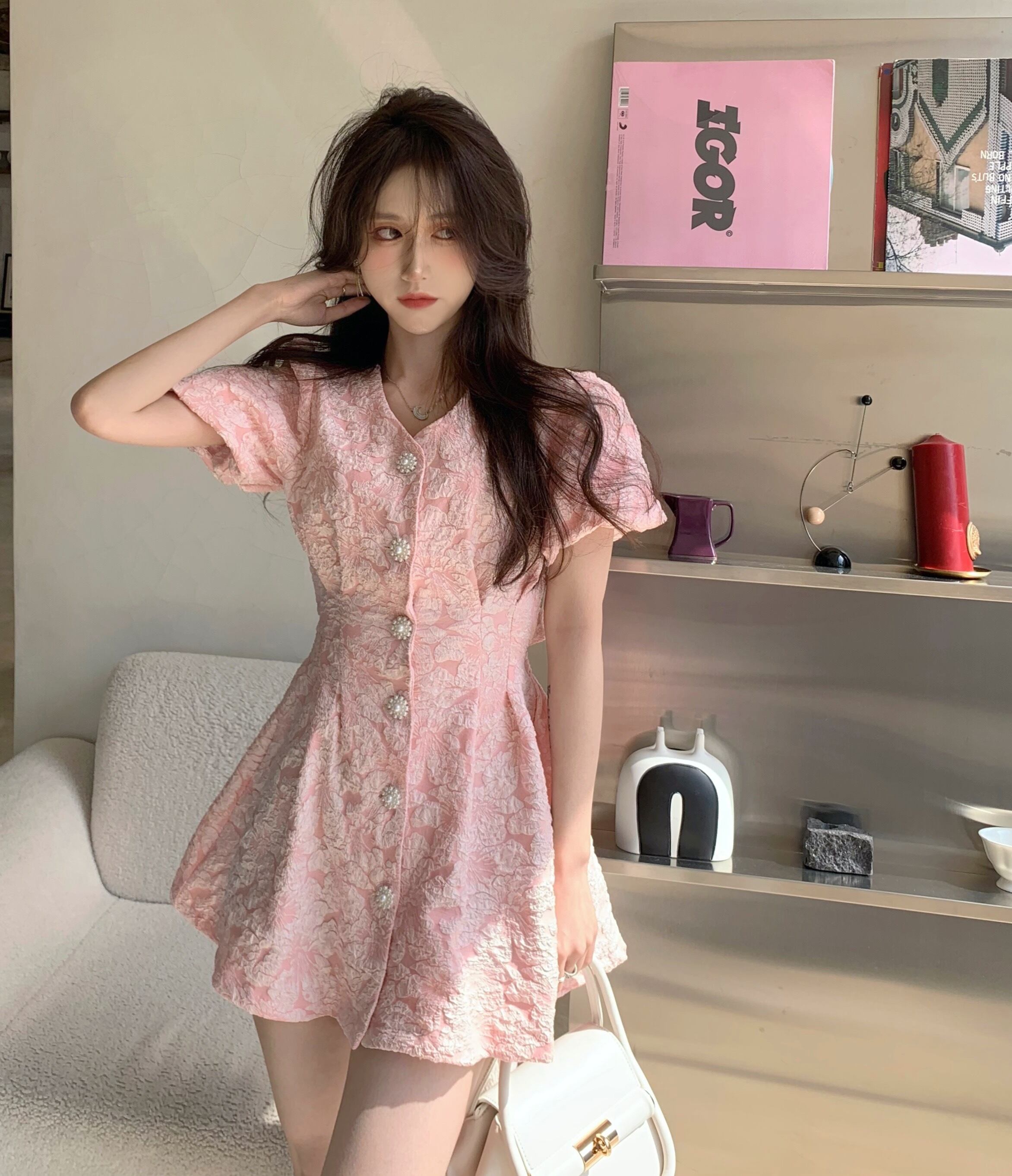 パールボタンスリーブドレス サマーバックVネックショートスカート 夏物 真珠 Xiaofeijia5524082871