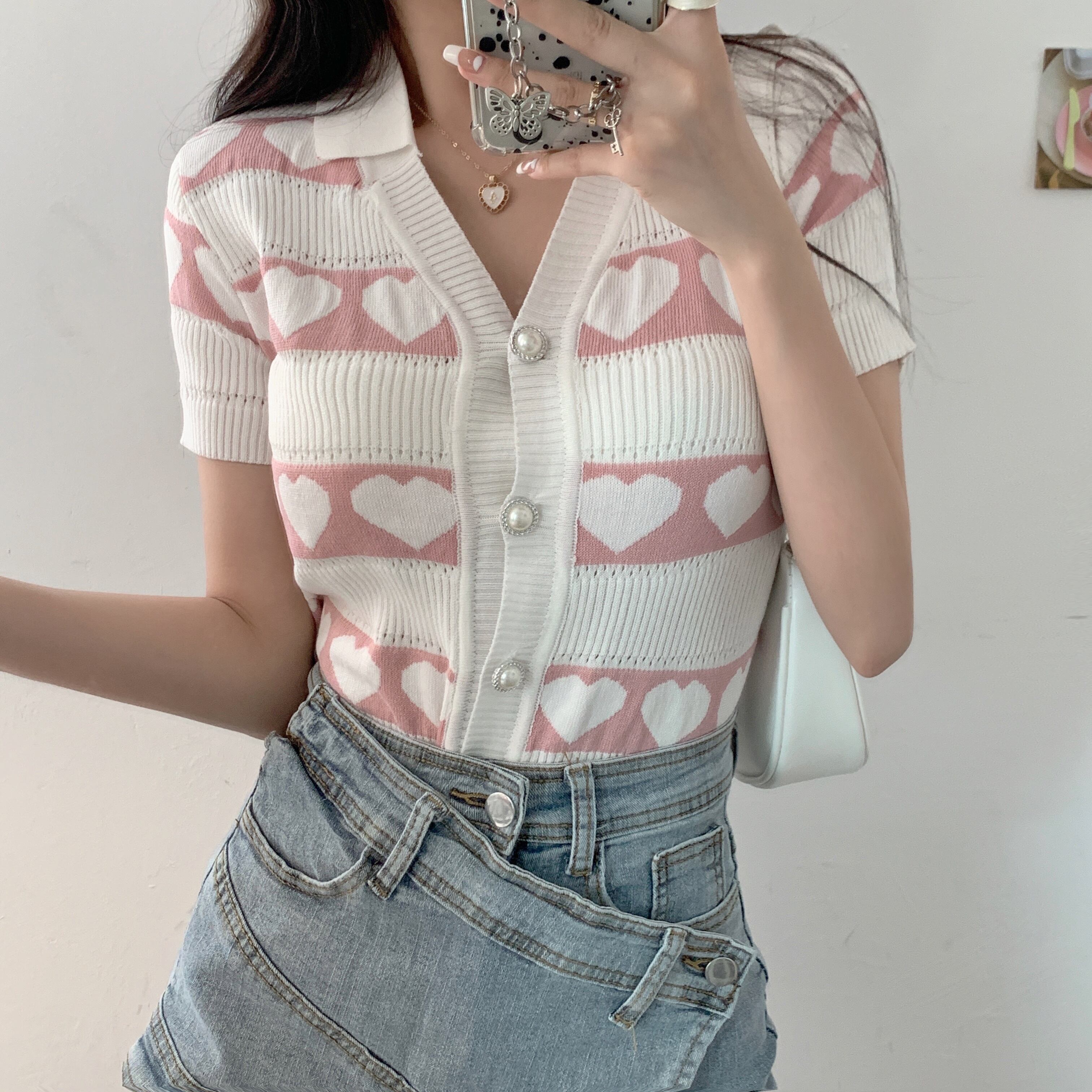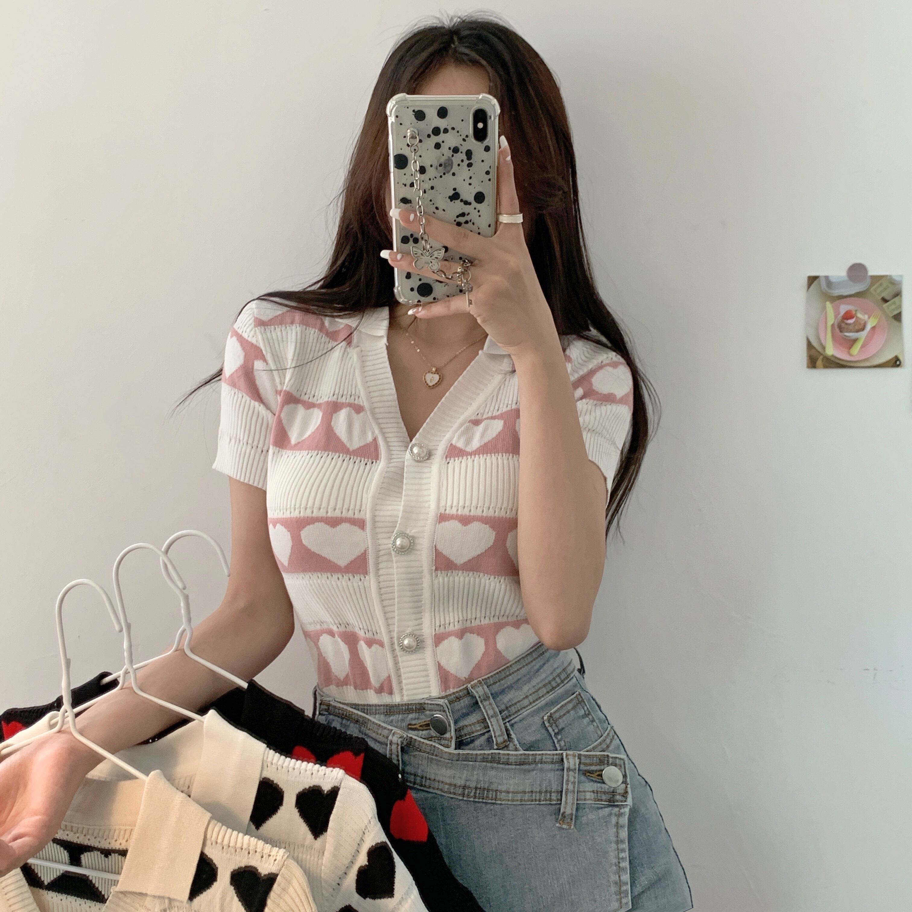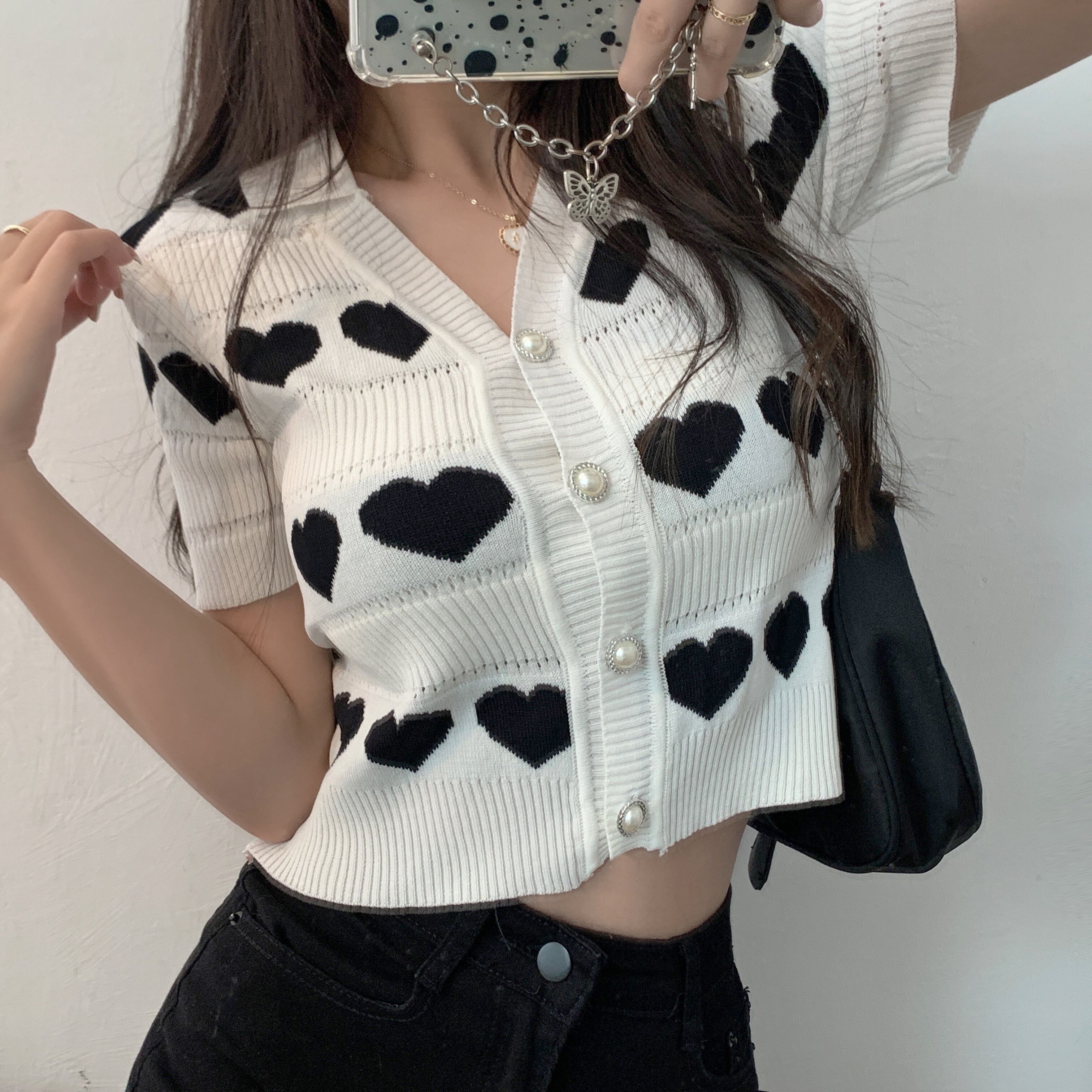ニットショート薄手サマーパールVネックスリムトップス カーディガン 夏物 真珠 Xiaofeijia40153424988