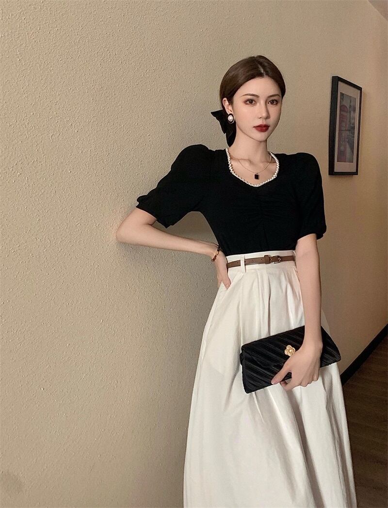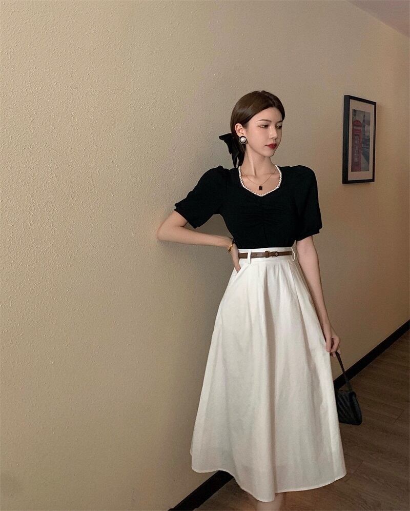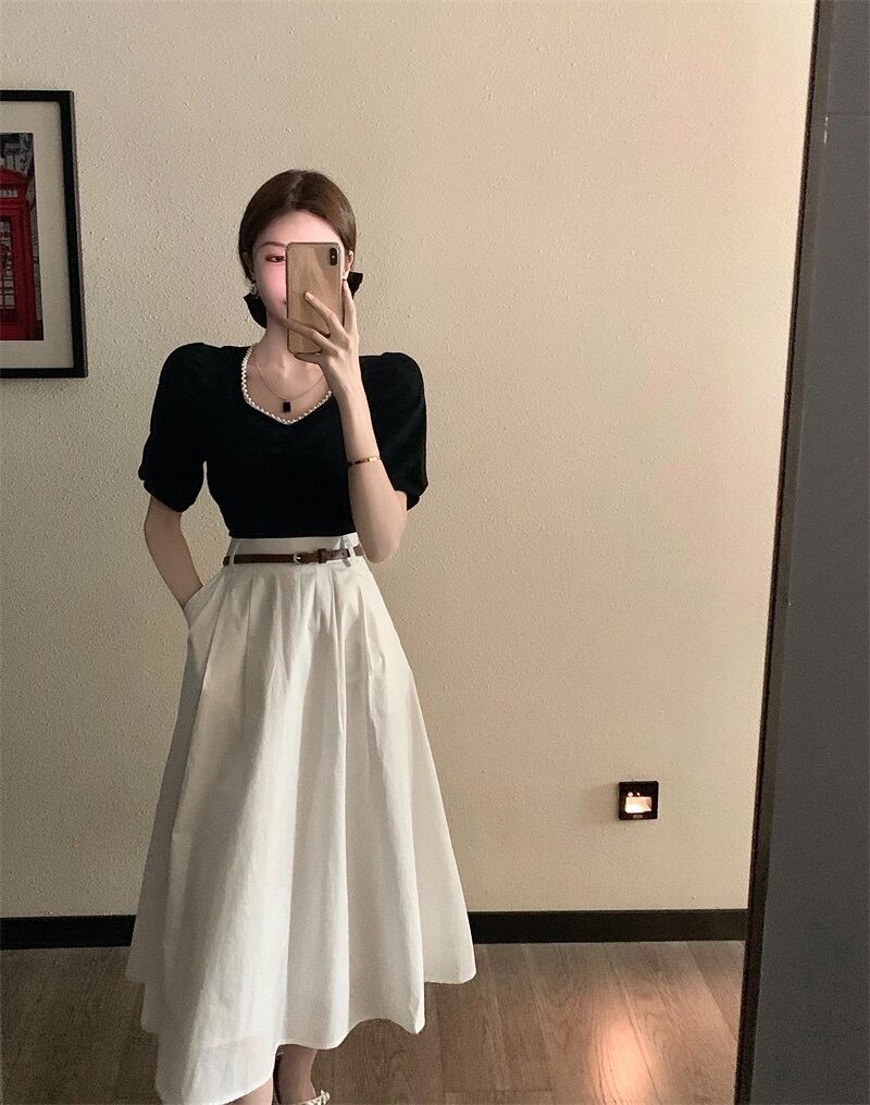 スリーブショートトップス スタンダードハイウェストウェストスカート サマー レトロ 夏物 Xiaofeijia82971759609