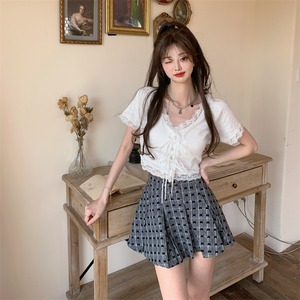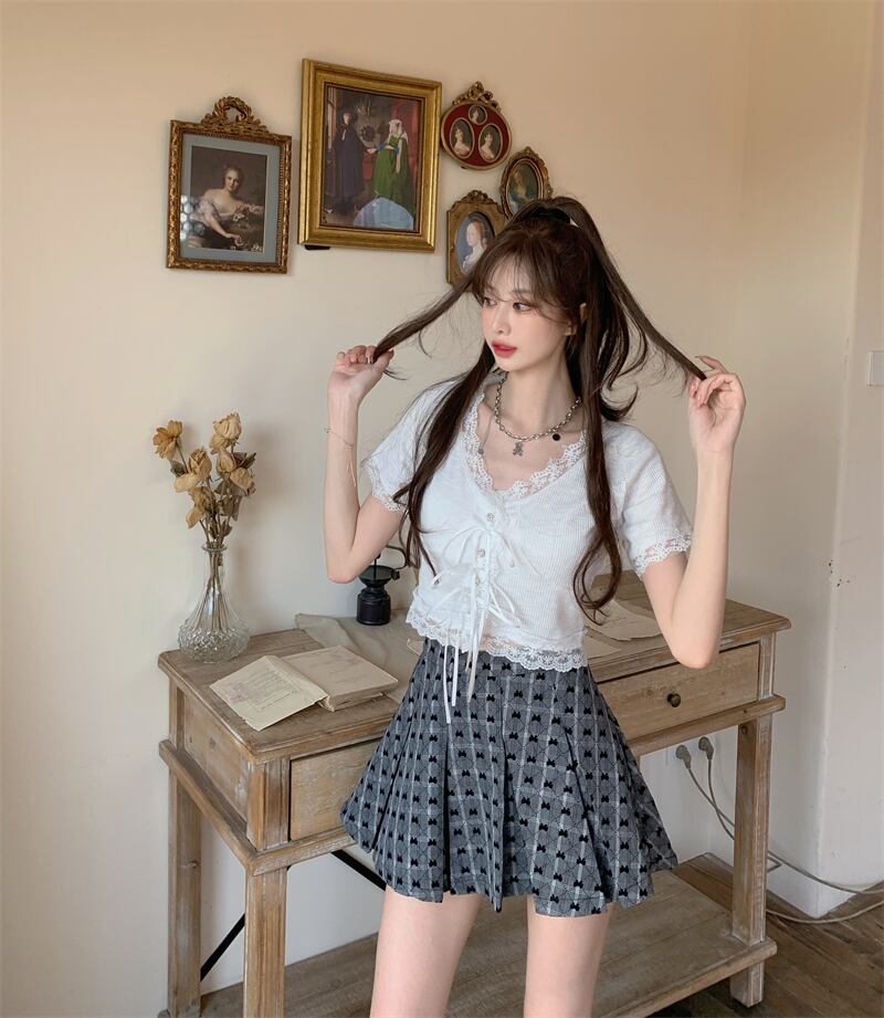 シフォンレースシャツ ブラックスリムスタイル半袖スリーブトップス セット ショート ハーフスリーブ Xiaofeijia34131794617