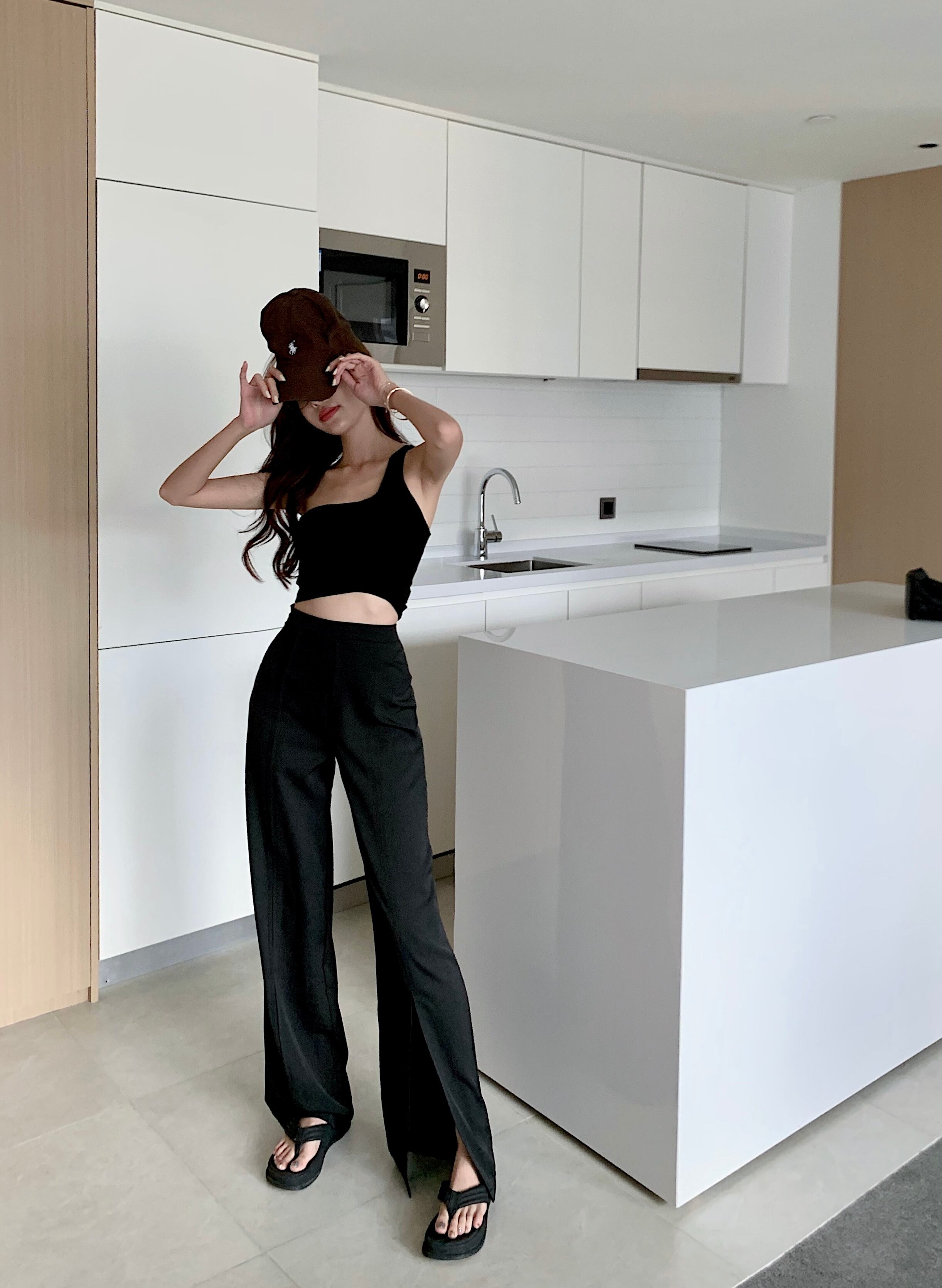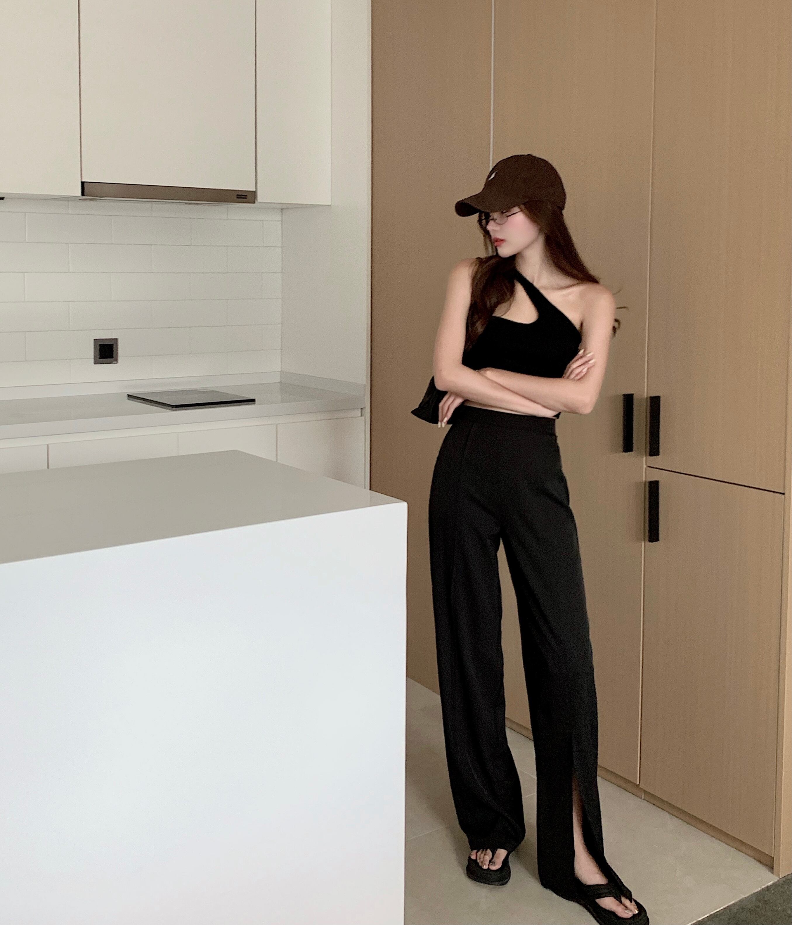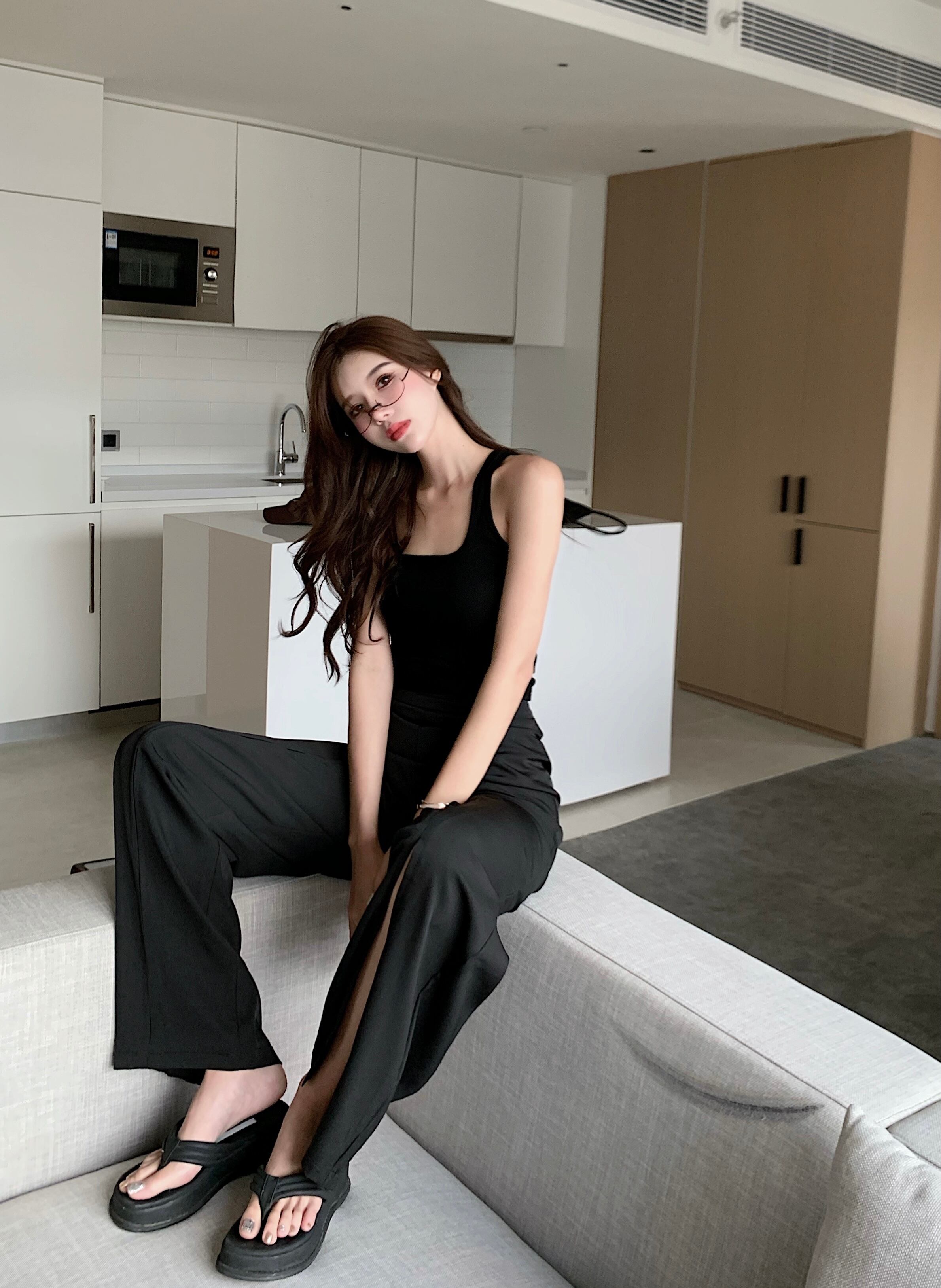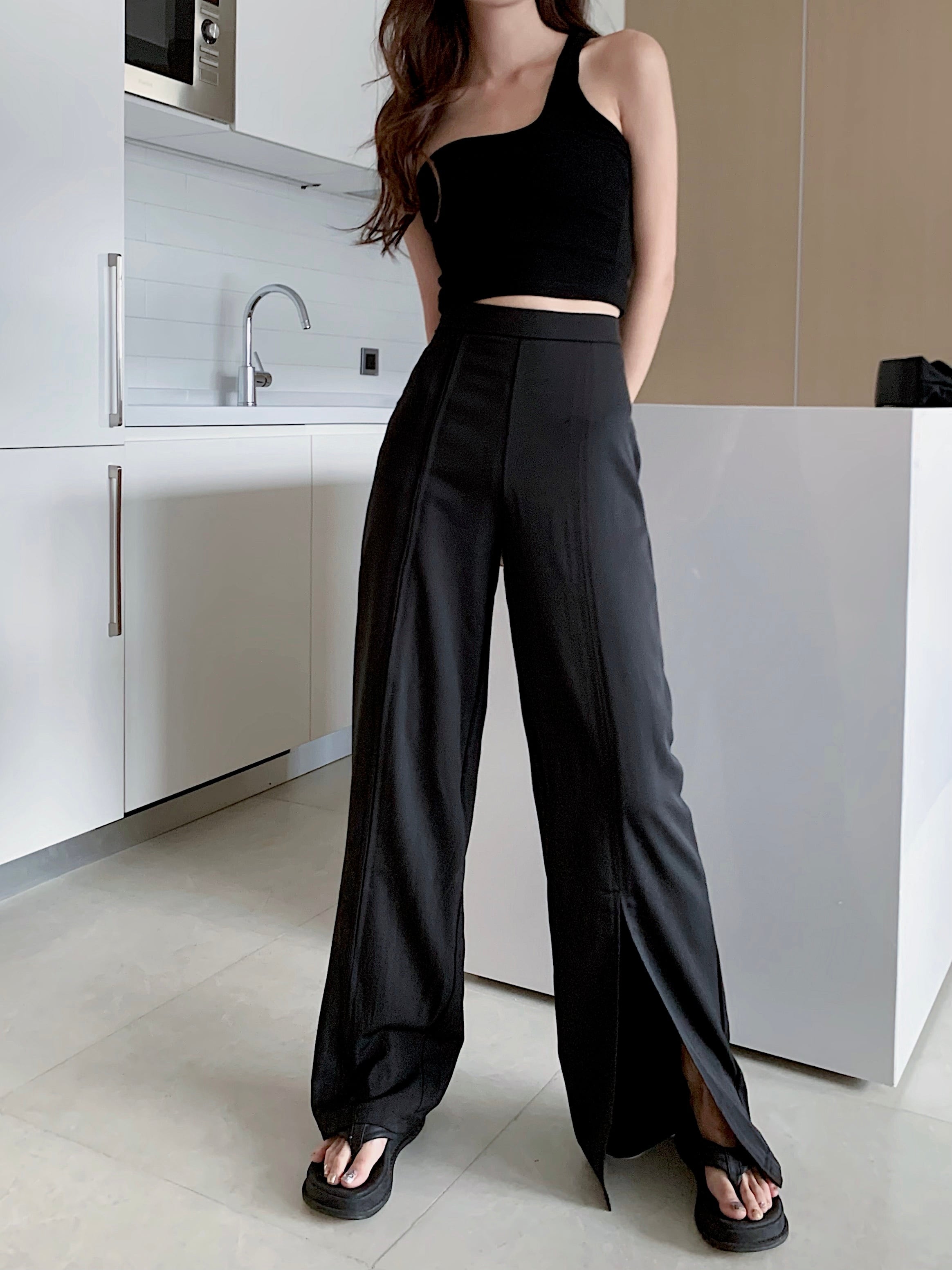スタンダードハイウェストウェストスリットワイドレッグ レトロ ワイドパンツ Xiaofeijia37467245337