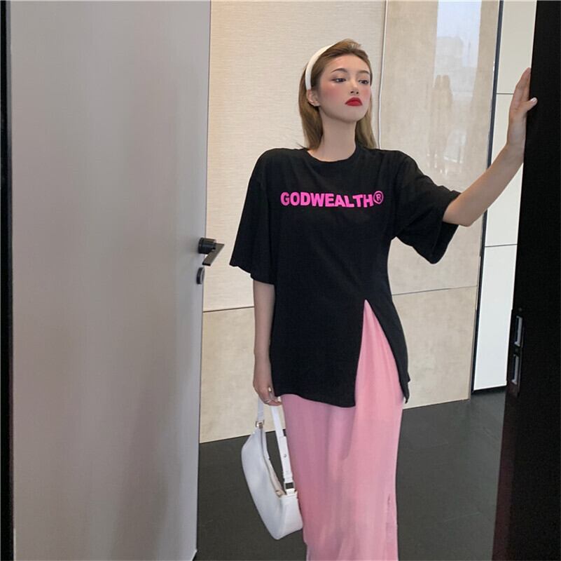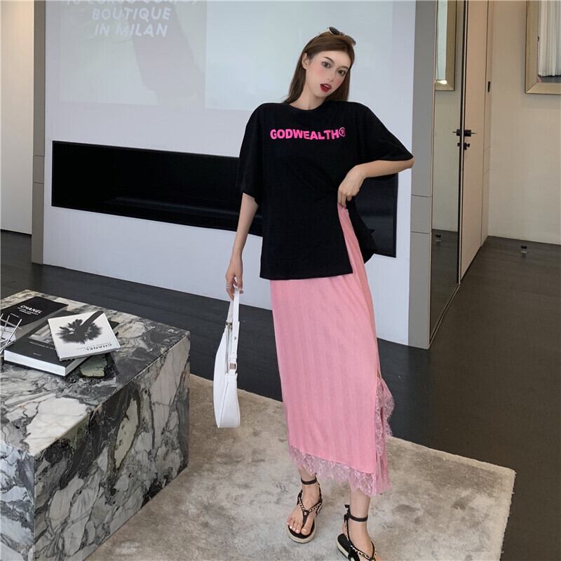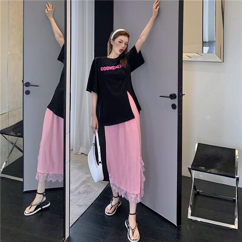 スカート サマープリントTシャツ ストレッチウェストレースレディース ストリート エラスティック 伸縮 夏物 ステッチ Xiaofeijia26220014270