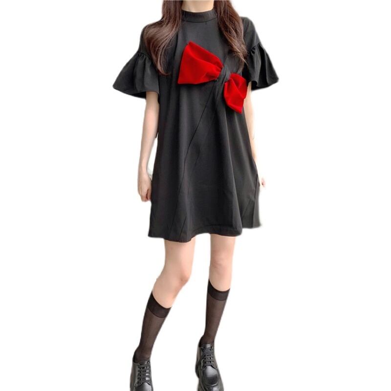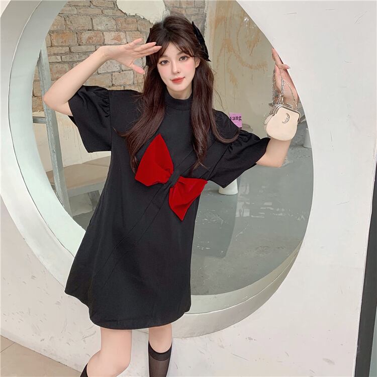 プリーツスリーブルーズ薄手ドレス リボン Xiaofeijia10992930981