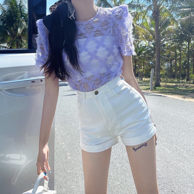 Flowerデザイン レースラウンドネックトップス レディースサマー 夏物 Oネック フラワーデザイン Xiaofeijia67367025733