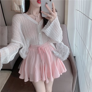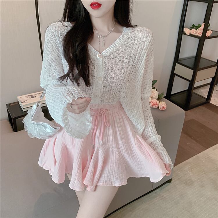 ホワイトパウダーストライプニットカーディガンストレッチウェストプリーツスカート サマー エラスティック 伸縮 大人ガーリー スウィート キュート カジュアル 夏物 シルク Xiaofeijia40602486783