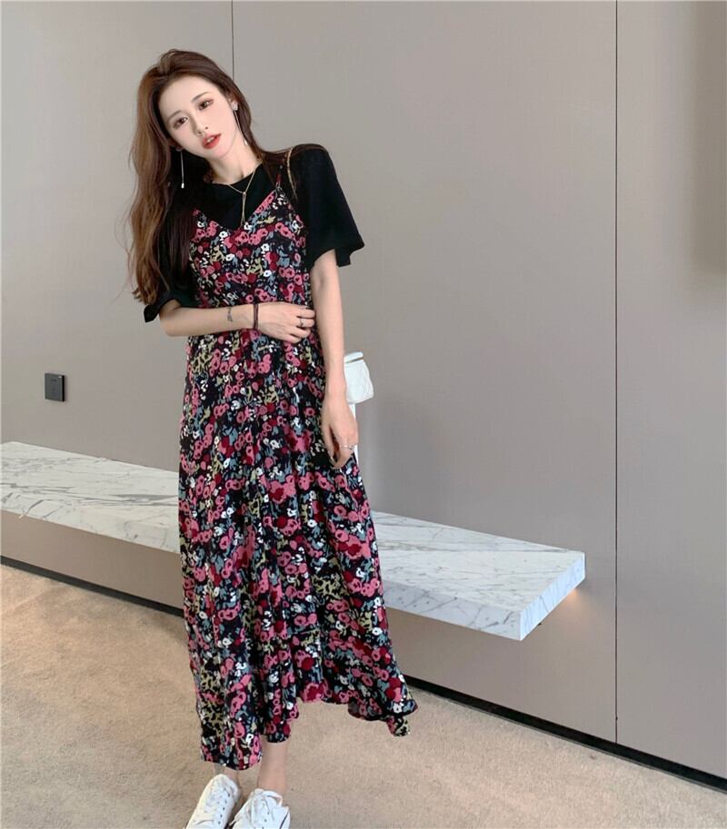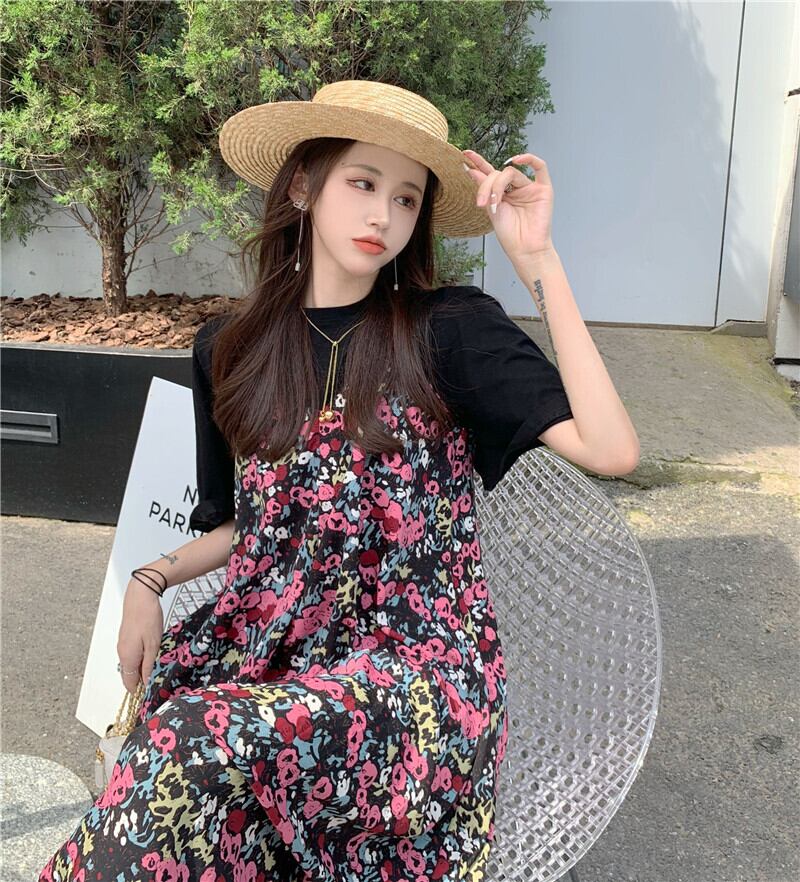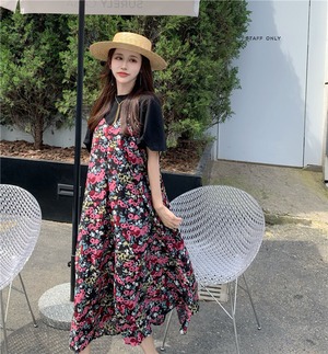 スカート サマーブラックTシャツ レースVネックフローラルドレス 夏物 花柄 Xiaofeijia26083571189