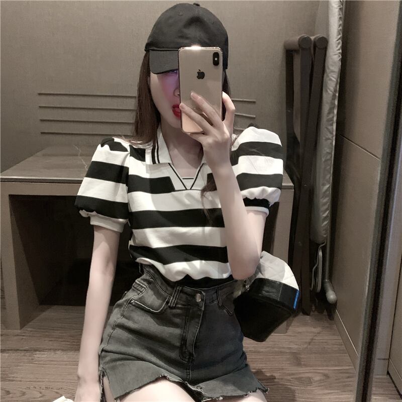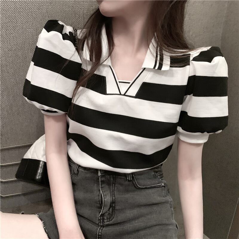 カラーストライプトップス カジュアルルーズスリーブTシャツ レディース Xiaofeijia33154201991