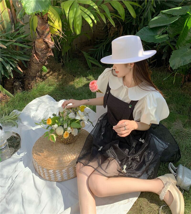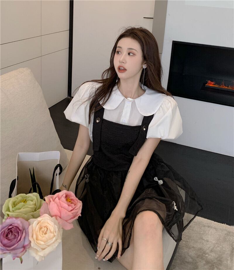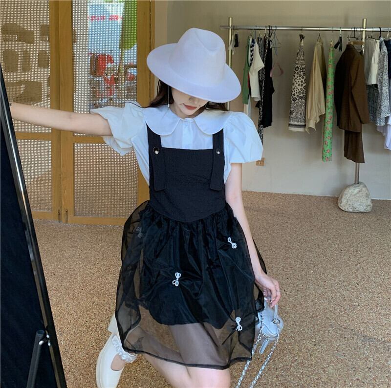 色:白のシャツ,ブラックサスペンダースカート,白いドレス