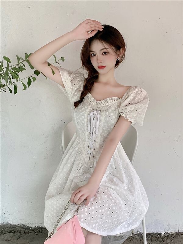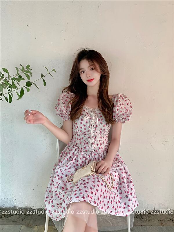 スタイルバンドメッシュフローラルスカート スリーブドレス 大人ガーリー スウィート キュート カジュアル 花柄 スクウェア ステッチ Xiaofeijia74349200972