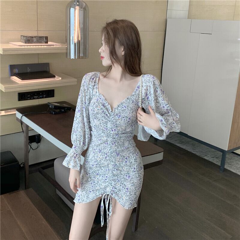 スリーブシフォンドレス スプリングサマーフローラルスカート ウェストショート ロング 春物 夏物 花柄 Xiaofeijia69204380415
