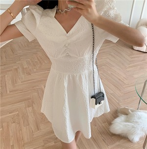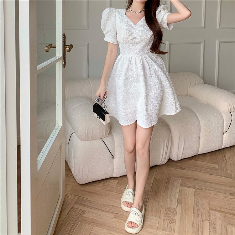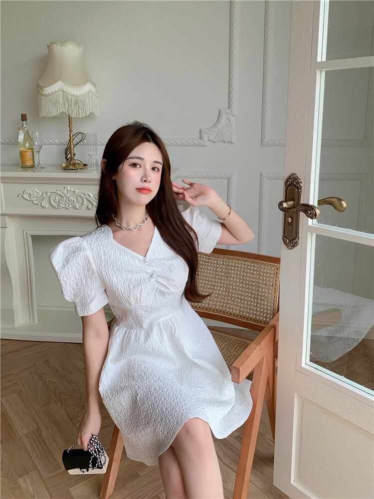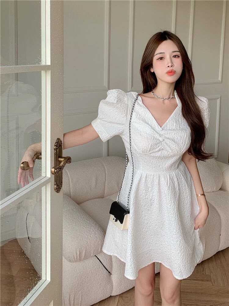 スカート ホワイトプリーツスリーブVネックドレス 大人ガーリー スウィート キュート カジュアル Xiaofeijia98608383792