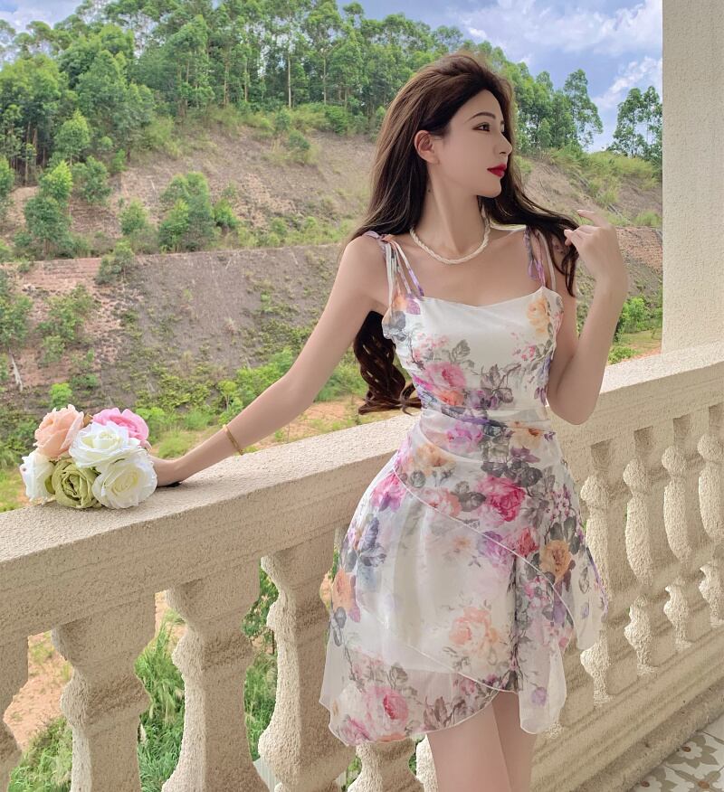 サマーフローラルウェストドレス 大人ガーリー スウィート キュート カジュアル 夏物 花柄 Xiaofeijia29543467094