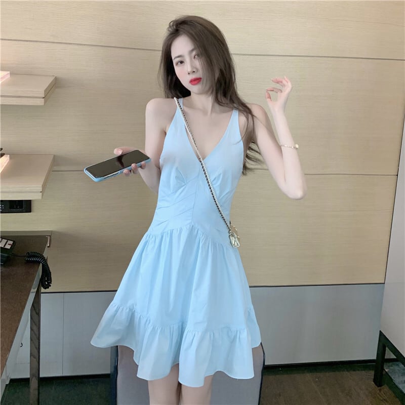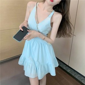 トライアングルスカート サマースタイルノースリーブウェスト薄手ブルードレス レース 夏物 レースアップ Xiaofeijia25095451608